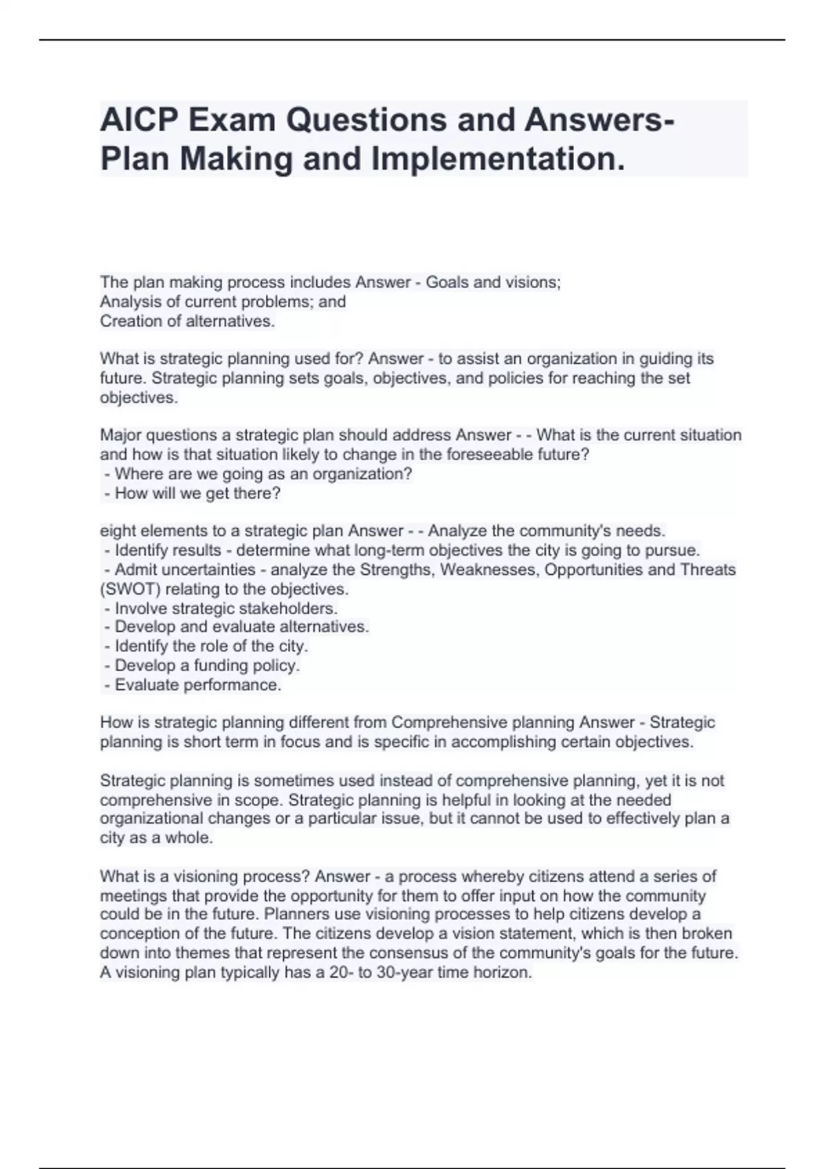 AICP Exam Questions and Answers- Plan Making and Implementation.