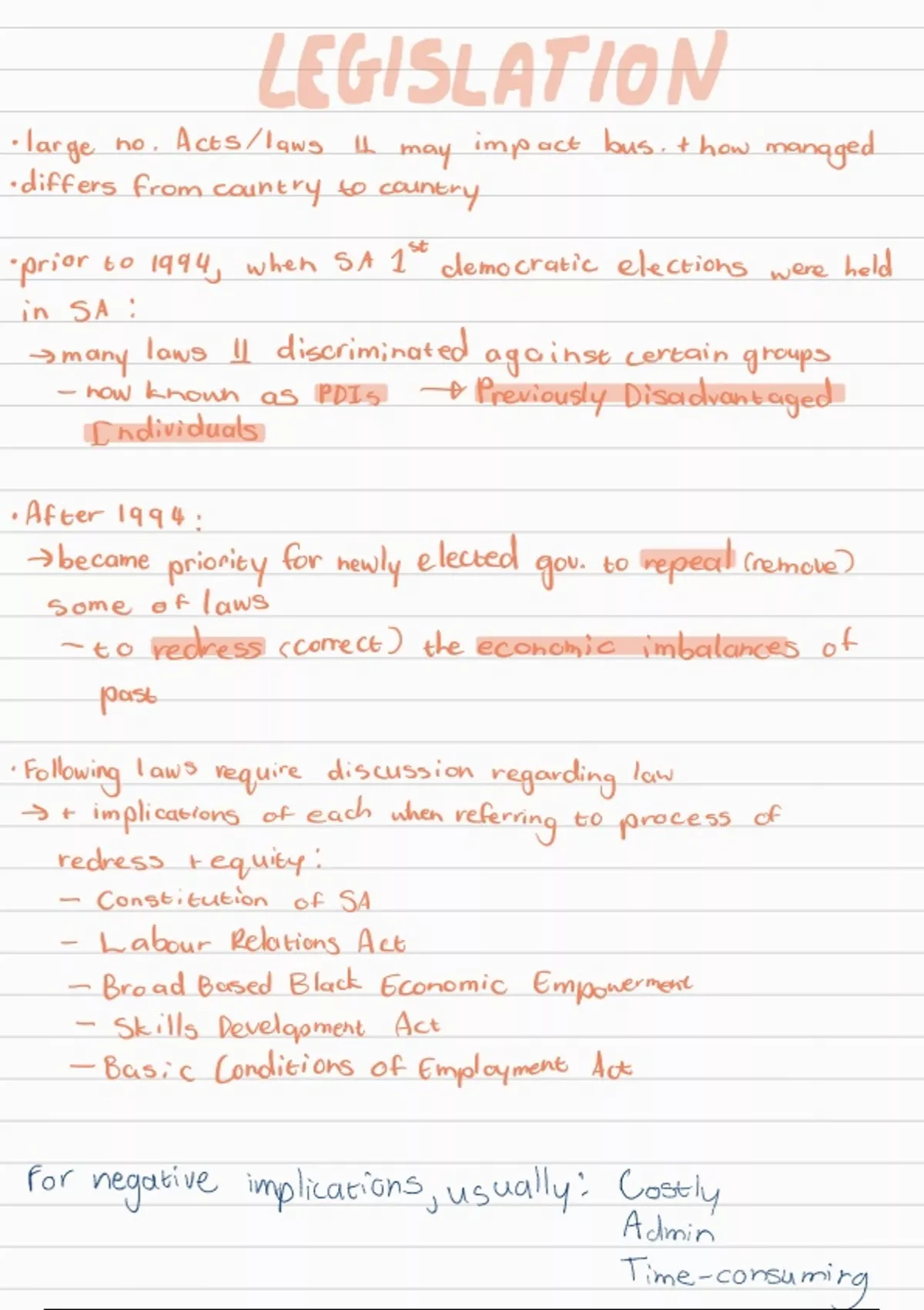 Summary Legislation Pt 1 - IEB Business Studies Notes