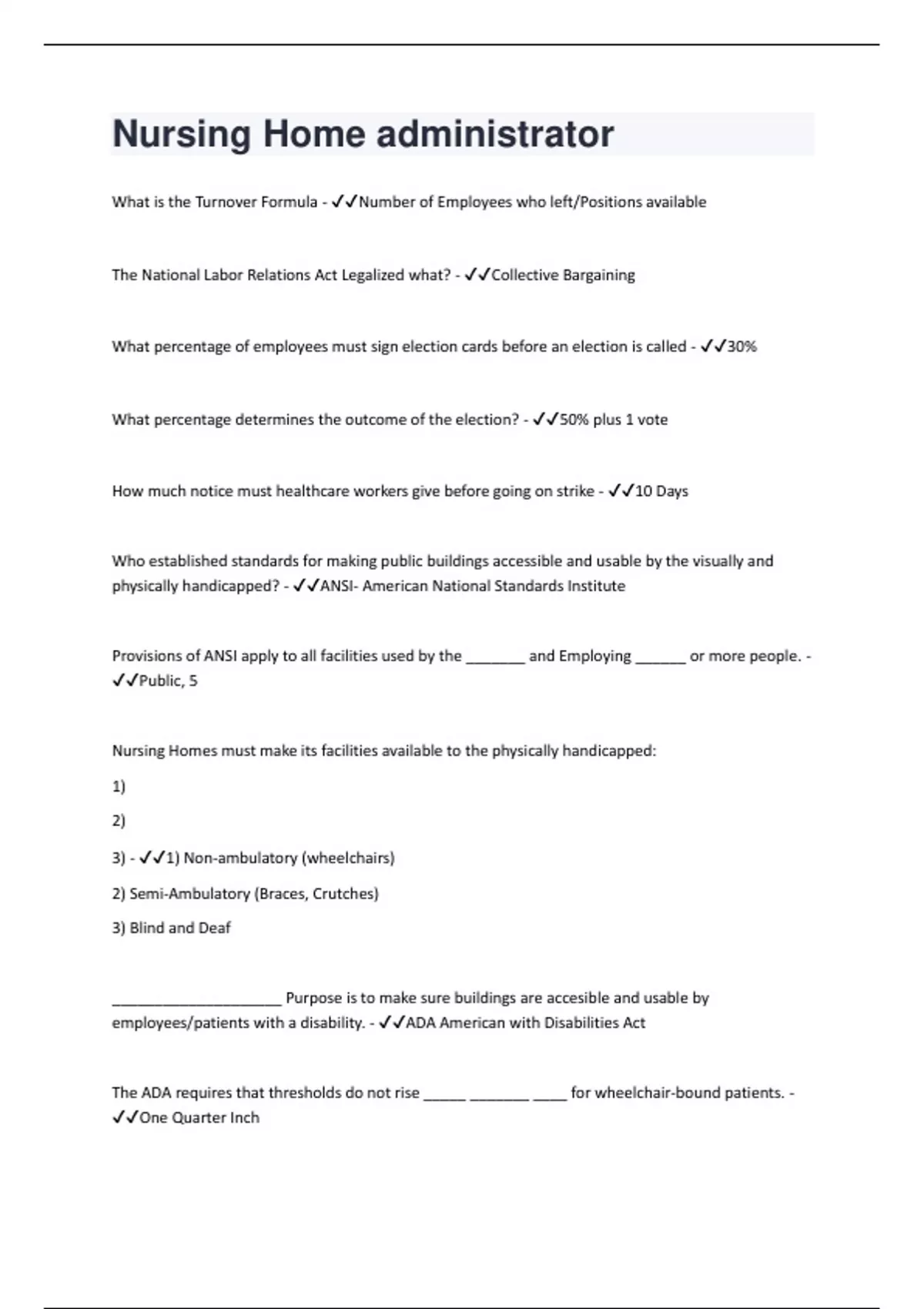What is the Turnover Formula - Number of Employees who left/Positions available The National Labor Relations Act Legalized what? - Collective Bargaining What percentage of employees must sign election cards before an election is called - 30% What percentage determines the outcome of the election? - 50% plus 1 vote How much notice must healthcare workers give before going on strike - 10 Days Who established standards for making public buildings accessible and usable by the visually and physically handicapped? - ANSI- American National Standards Institute Provisions of ANSI apply to all facilities used by the _______ and Employing ______ or more people. - Public, 5 Nursing Homes must make its facilities available to the physically handicapped: 1) 2) 3) - 1) Non-ambulatory (wheelchairs) 2) Semi-Ambulatory (Braces, Crutches) 3) Blind and Deaf ____________________ Purpose is to make sure buildings are accesible and usable by employees/patients with a disability. - ADA American with Disabilities Act The ADA requires that thresholds do not rise _____ _______ ____ for wheelchair-bound patients. - One Quarter InchTitle 1 does What? Title 2 does what? - 1) Establishes guidelines for hiring individuals with disability 2) Deals with making the work place more accessible In older buildings a dead-end corridor may not exceed_____ ft beyond an exit. How many for new construction? - 30 May not have deadend corridors No room shall be more that ______ ft from an exit. - 100 Exits used for egress must have what? - lighted exit sign All areas must be _____________ to the outside of the building. - Ventilated Temperaures must range between ? - 71-81F