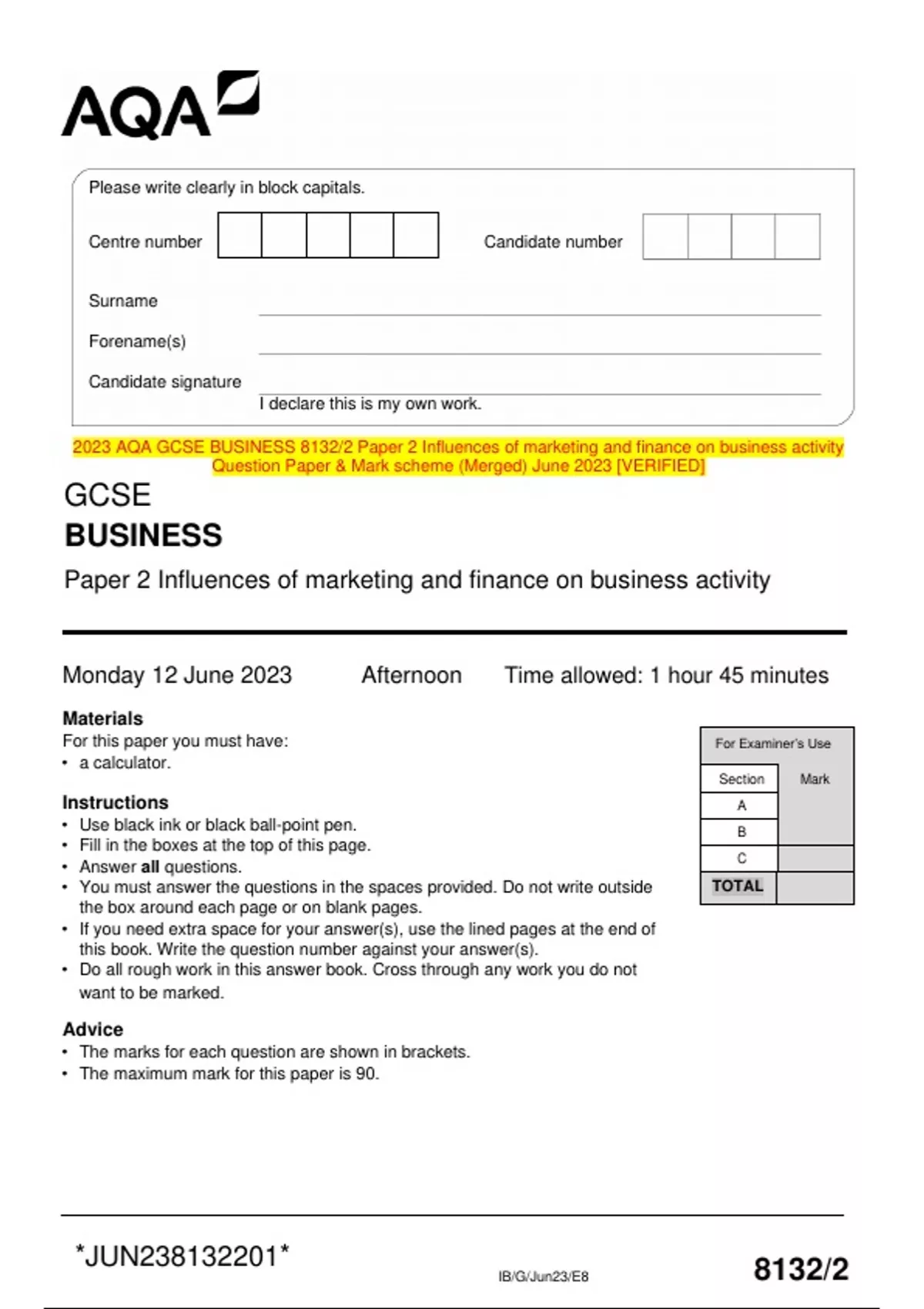 2023 AQA GCSE BUSINESS 8132/2 Paper 2 Influences of marketing and finance on business activity Question Paper & Mark scheme (Merged) June 2023 [VERIFIED]
