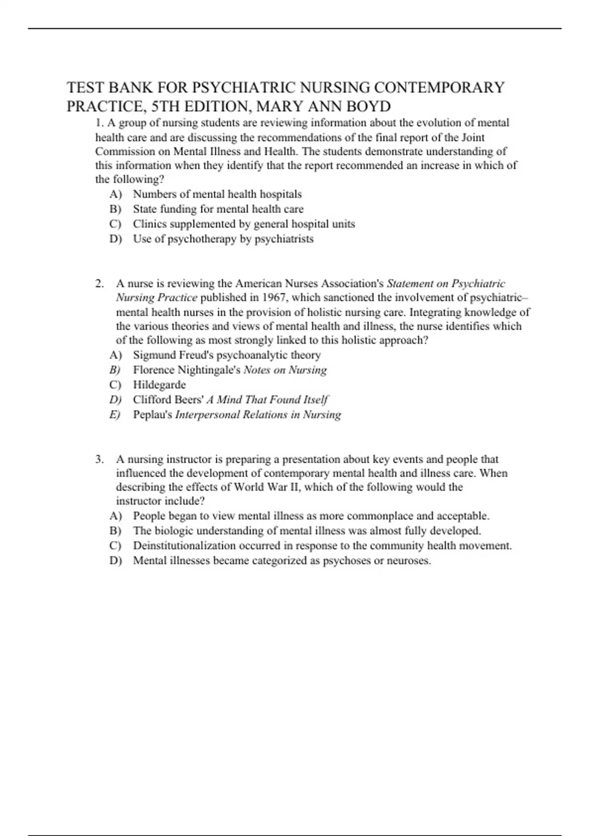 1. A group of nursing students are reviewing information about the evolution of mental health care and are discussing the recommendations of the final report of the Joint Commission on Mental Illness and Health. The students demonstrate understanding of this information when they identify that the report recommended an increase in which of the following? A) Numbers of mental health hospitals B) State funding for mental health care C) Clinics supplemented by general hospital units D) Use of psychotherapy by psychiatrists 2. A nurse is reviewing the American Nurses Association's Statement on Psychiatric Nursing Practice published in 1967, which sanctioned the involvement of psychiatric– mental health nurses in the provision of holistic nursing care. Integrating knowledge of the various theories and views of mental health and illness, the nurse identifies which of the following as most strongly linked to this holistic approach? A) Sigmund Freud's psychoanalytic theory B) Florence Nightingale's Notes on Nursing C) Hildegarde D) Clifford Beers' A Mind That Found Itself E) Peplau's Interpersonal Relations in Nursing 3. A nursing instructor is preparing a presentation about key events and people that influenced the development of contemporary mental health and illness care. When describing the effects of World War II, which of the following would the instructor include? A) People began to view mental illness as more commonplace and acceptable. B) The biologic understanding of mental illness was almost fully developed. C) Deinstitutionalization occurred in response to the community health movement. D) Mental illnesses became categorized as psychoses or neuroses. 4. A nursing student is presenting a discussion of the history of psychiatric–mental health nursing and its place within nursing history. Which of the following would be most appropriate to include? A) Certification for the psychiatric–mental health nursing specialty was first emphasized by Mary Adelaide Nutting. B) Psychiatric nurses played a part in seeing that all deinstitutionalized patients got treatment at community mental health centers. C) There is a historical link between the first nursing program to admit male students and the first training school for psychiatric nursing. D) The first graduate program in psychiatric nurses was established in response to the publication of psychiatric nursing specialty journals. 5. Two nursing students are discussing psychiatric–mental health nursing and the role it has played in nursing's overall history. Which statement is most accurate? A) The importance of using therapeutic communication was stressed by Nightingale. B) The use of self-care to enhance the immune system was taught by Dorothea Dix. C) The moral treatment of mental illness was a primary focus of deinstitutionalization. D) Peplau was the first nurse to stress the importance of therapeutic communication. 6. When reviewing the evolution of mental health and illness care, which event is associated with mental disorders beginning to be viewed as illnesses requiring treatment? A) Establishment of Pennsylvania Hospital in Philadelphia B) Quaker establishment of asylums C) Creation of the state hospital system D) Freud's views on the causes of mental illnesses 7. A psychiatric–mental health nurse is working on a committee that is developing programs that integrate the objectives for mental health and mental disorders as identified in Healthy People 2020. Which type of program would be least appropriate? A) Single substance abuse treatment programs B) Depression screening programs for primary care providers C) Mental health programs for the homeless population D) Employment programs for those with serious mental illness 8. A nursing instructor is describing the concept of evidence-based practice in psychiatric–mental health nursing. Which of the following would the instructor include as being important? Select all that apply. A) Research findings B) Expert opinion C) Clinical experiences D) Patient data E) Established routines 9. The following events are important in the development of psychiatric–mental health nursing practice. Which event occurred first? A) Publication of Standards of Psychiatric-Mental Health Nursing by the ANA B) Publication of Standards of Child and Adolescent Psychiatric and Mental Health Nursing Practice C) Establishment of the first graduate program in psychiatric nursing at Rutgers University D) Publication of the first psychiatric nursing text, Nursing Mental Disease, by Harriet Bailey