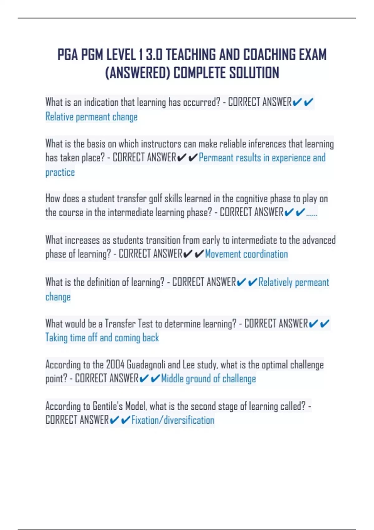 PGA PGM LEVEL 1 3.0 TEACHING AND COACHING EXAM (ANSWERED) COMPLETE SOLUTION