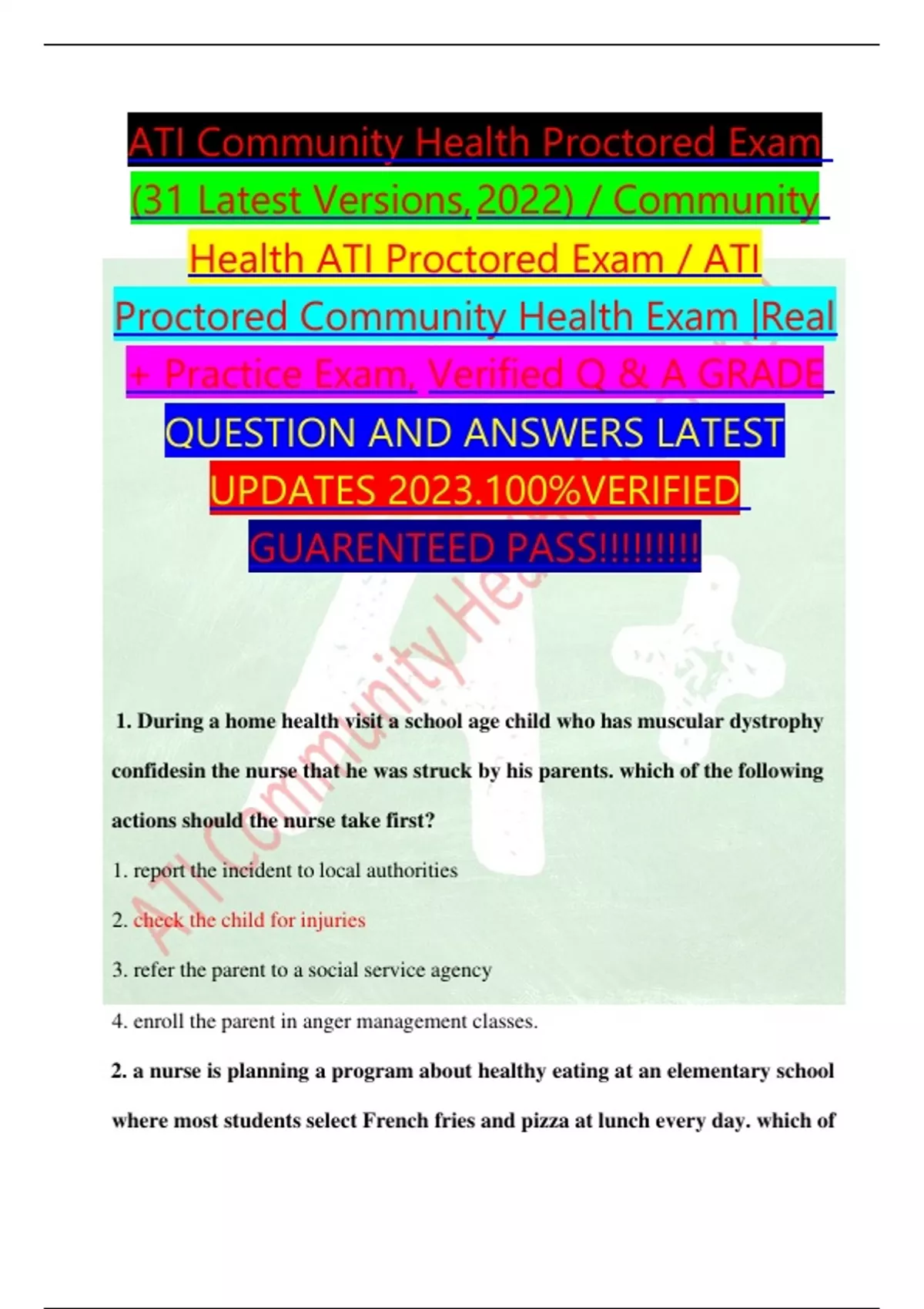 ATI Community Health Proctored Exam (31 Latest Versions,2022) / Community Health ATI Proctored Exam / ATI Proctored Community Health Exam |Real + Practice Exam,Verified Q & A GRADE QUESTION AND ANSWERS LATEST UPDATES2023.100%VERIFIED GUARENTEEDPASS!!!!!!!