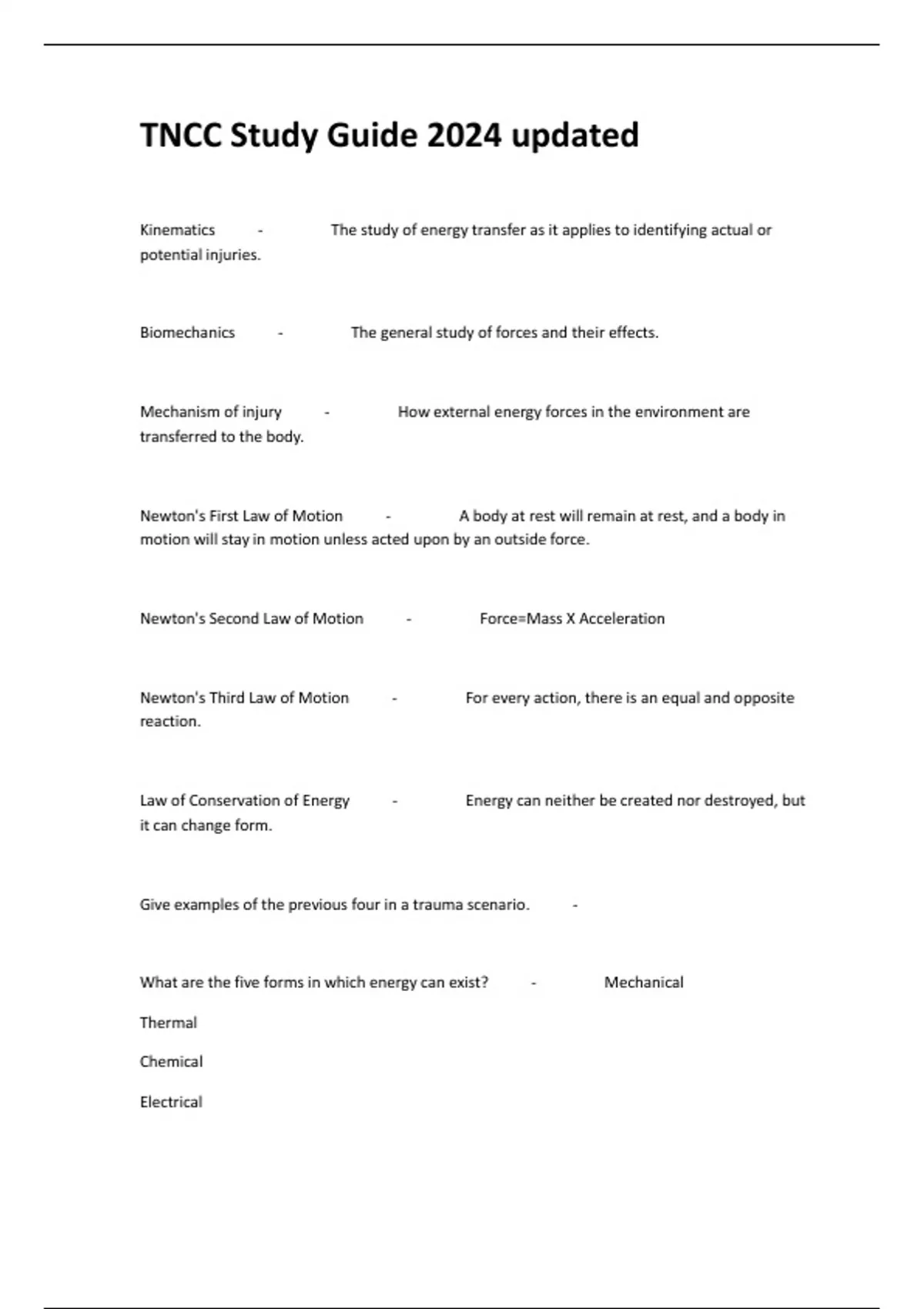 TNCC Study Guide 2024 updated Kinematics - The study of energy transfer as it applies to identifying actual or potential injuries. Biomechanics - The general study of forces and their effects. Mechanism of injury - How external energy forces in the environment are transferred to the body. Newton's First Law of Motion - A body at rest will remain at rest, and a body in motion will stay in motion unless acted upon by an outside force. Newton's Second Law of Motion - Force=Mass X Acceleration Newton's Third Law of Motion - For every action, there is an equal and opposite reaction. Law of Conservation of Energy - Energy can neither be created nor destroyed, but it can change form. Give examples of the previous four in a trauma scenario. - What are the five forms in which energy can exist? - Mechanical Thermal Chemical Electrical Radiant External Forces of Trauma - Deceleration Acceleration Compression Internal Forces of Trauma - Compression Tension Shear How do internal forces protect the body from trauma? - It resists the applied external force. Tissues and organs change their dimensions to accommodate the external force. What are the four main types of traumatic energy? Example? - Blunt Penetrating Thermal Blast Deceleration ? - Sudden stop of body's motion. Acceleration? - Sudden and rapid onset of motion. What environmental and pathophysiological factors are considered when the mechanism of injury is a fall? - The point of impact on the patient's body. The type of surface that is hit and the extent that surface can absorb the energy. The tissue's ability to resist If a person is pushed or accidentally knocked down. What are the three impacts in a MVC? - First (Vehicle hits object) Second (Occupant collides with interior) Third (Internal structures collides with body cavity) Five mechanisms of injury in blunt trauma? - Primary (blast injuries) Secondary (Fragment injuries) Tertiary (Blunt object injuries) Quaternary (Thermal injuries) Quinary (Chemical injuries)
