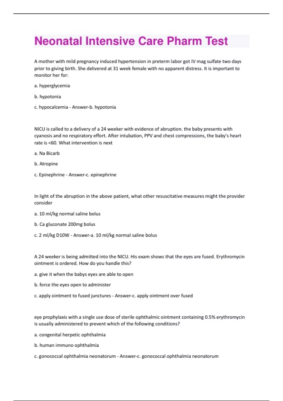 A mother with mild pregnancy induced hypertension in preterm labor got IV mag sulfate two days prior to giving birth. She delivered at 31 week female with no apparent distress. It is important to monitor her for: a. hyperglycemia b. hypotonia c. hypocalcemia - Answer-b. hypotonia NICU is called to a delivery of a 24 weeker with evidence of abruption. the baby presents with cyanosis and no respiratory effort. After intubation, PPV and chest compressions, the baby's heart rate is <60. What intervention is next a. Na Bicarb b. Atropine c. Epinephrine - Answer-c. epinephrine In light of the abruption in the above patient, what other resuscitative measures might the provider consider a. 10 ml/kg normal saline bolus b. Ca gluconate 200mg bolus c. 2 ml/kg D10W - Answer-a. 10 ml/kg normal saline bolus A 24 weeker is being admitted into the NICU. His exam shows that the eyes are fused. Erythromycin ointment is ordered. How do you handle this? a. give it when the babys eyes are able to open b. force the eyes open to administer c. apply ointment to fused junctures - Answer-c. apply ointment over fused eye prophylaxis with a single use dose of sterile ophthalmic ointment containing 0.5% erythromycin is usually administered to prevent which of the following conditions? a. congenital herpetic ophthalmia b. human immuno ophthalmia c. gonococcal ophthalmia neonatorum - Answer-c. gonococcal ophthalmia neonatoruma drug used to treat apnea is the preterm infant is: a. indocin b. surfactant c. caffeine - Answer-c. caffeine