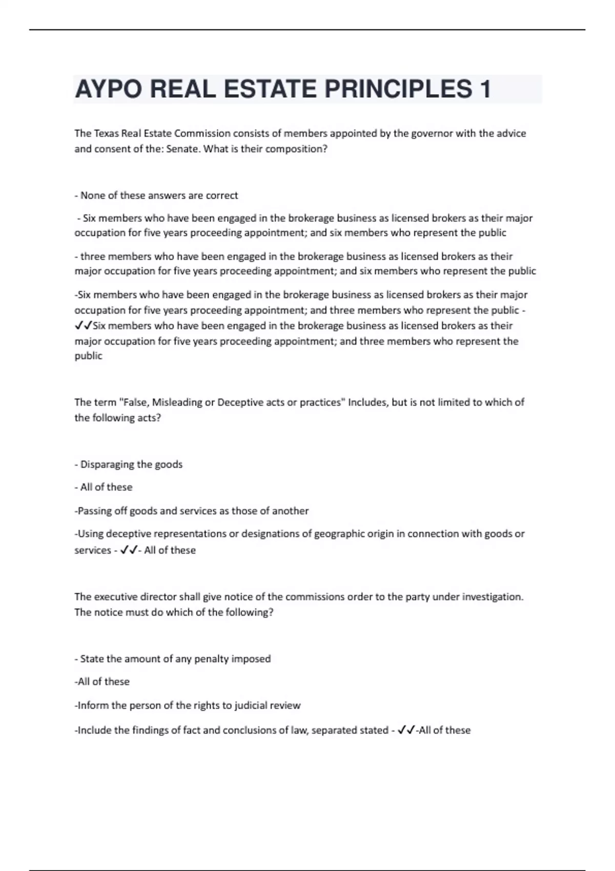 The Texas Real Estate Commission consists of members appointed by the governor with the advice and consent of the: Senate. What is their composition? - None of these answers are correct - Six members who have been engaged in the brokerage business as licensed brokers as their major occupation for five years proceeding appointment; and six members who represent the public - three members who have been engaged in the brokerage business as licensed brokers as their major occupation for five years proceeding appointment; and six members who represent the public -Six members who have been engaged in the brokerage business as licensed brokers as their major occupation for five years proceeding appointment; and three members who represent the public - Six members who have been engaged in the brokerage business as licensed brokers as their major occupation for five years proceeding appointment; and three members who represent the public The term "False, Misleading or Deceptive acts or practices" Includes, but is not limited to which of the following acts? - Disparaging the goods - All of these -Passing off goods and services as those of another -Using deceptive representations or designations of geographic origin in connection with goods or services - - All of these The executive director shall give notice of the commissions order to the party under investigation. The notice must do which of the following? - State the amount of any penalty imposed -All of these -Inform the person of the rights to judicial review -Include the findings of fact and conclusions of law, separated stated - -All of thesePublic beach policy for the state of Texas Includes - The public shall have free and unrestricted right of ingress and egress to and for the state owned beaches bordering the Seward shore of the gulf of Mexico Emblements - Harvestable plants, tress, and cultivated vegetation