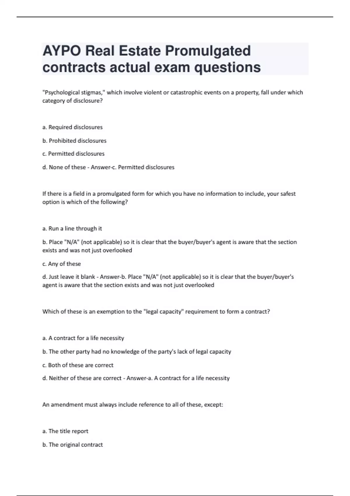 "Psychological stigmas," which involve violent or catastrophic events on a property, fall under which category of disclosure? a. Required disclosures b. Prohibited disclosures c. Permitted disclosures d. None of these - Answer-c. Permitted disclosures If there is a field in a promulgated form for which you have no information to include, your safest option is which of the following? a. Run a line through it b. Place "N/A" (not applicable) so it is clear that the buyer/buyer's agent is aware that the section exists and was not just overlooked c. Any of these d. Just leave it blank - Answer-b. Place "N/A" (not applicable) so it is clear that the buyer/buyer's agent is aware that the section exists and was not just overlooked Which of these is an exemption to the "legal capacity" requirement to form a contract? a. A contract for a life necessity b. The other party had no knowledge of the party's lack of legal capacity c. Both of these are correct d. Neither of these are correct - Answer-a. A contract for a life necessity
