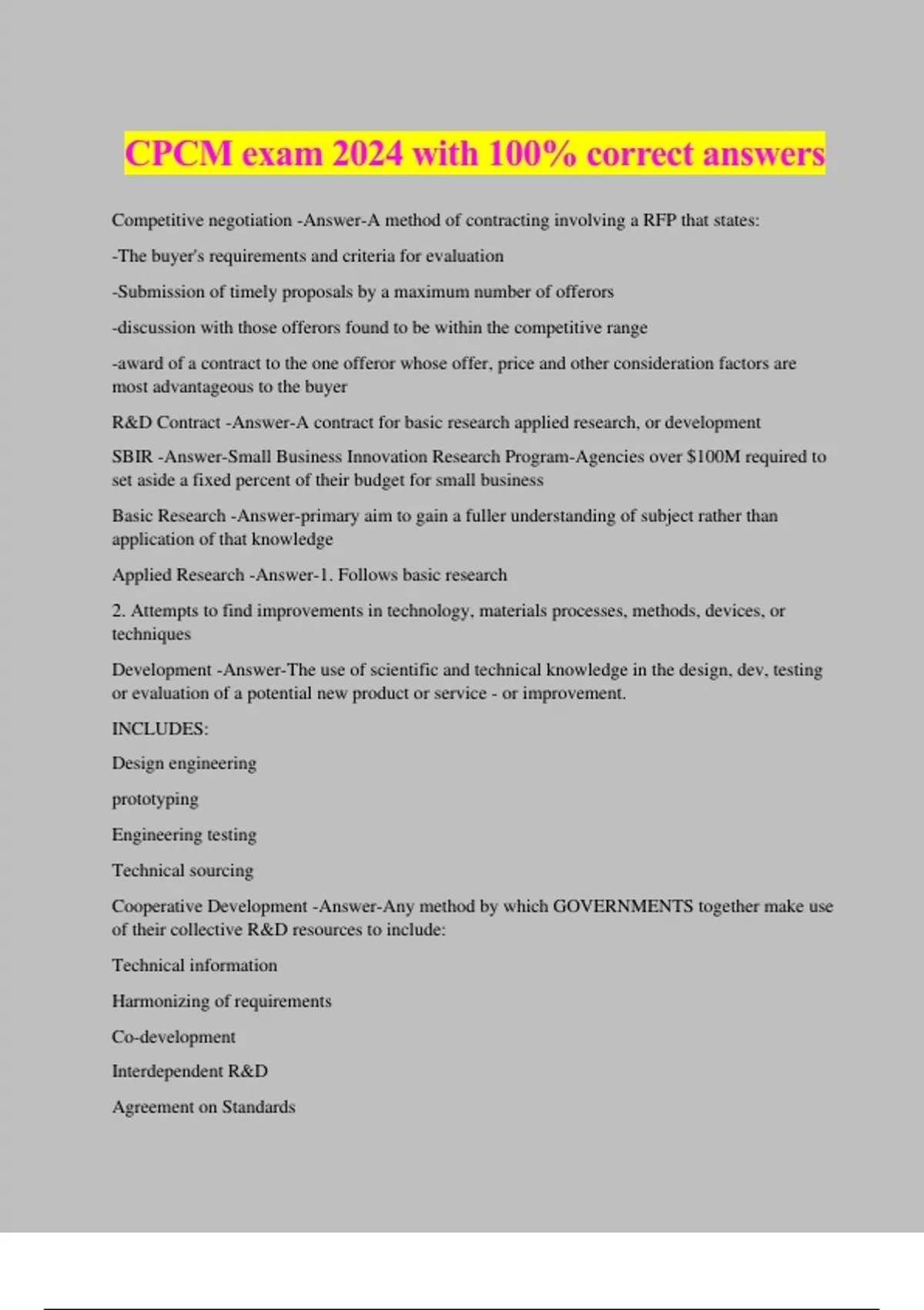 CPCM exam 2024 with 100% correct answers Competitive negotiation -Answer-A method of contracting involving a RFP that states: -The buyer's requirements and criteria for evaluation -Submission of timely proposals by a maximum number of offerors -discussion with those offerors found to be within the competitive range -award of a contract to the one offeror whose offer, price and other consideration factors are most advantageous to the buyer R&D Contract -Answer-A contract for basic research applied research, or development SBIR -Answer-Small Business Innovation Research Program-Agencies over $100M required to set aside a fixed percent of their budget for small business Basic Research -Answer-primary aim to gain a fuller understanding of subject rather than application of that knowledge Applied Research -Answer-1. Follows basic research 2. Attempts to find improvements in technology, materials processes, methods, devices, or techniques Development -Answer-The use of scientific and technical knowledge in the design, dev, testing or evaluation of a potential new product or service - or improvement. INCLUDES: Design engineering prototyping Engineering testing Technical sourcing Cooperative Development -Answer-Any method by which GOVERNMENTS together make use of their collective R&D resources to include: Technical information Harmonizing of requirements Co-development Interdependent R&D Agreement on Standards Government R&D -Answer-Purpose: To achieve agency and national goals Commercial R&D -Answer-Future -oriented, long-term activities for profit Uniform Commercial Code (UCC) -Answer-Primary source of commercial contract Law -adopted as law by each state -Adopted by all but Louisiana -Governs the sale of any kind of goods -General Principles of contract law Statutory Law -Answer--Laws passed by legislation -Common Law-judge decision -May require some contracts to be in writing and executed using specific procedures Private Law -Answer-Includes the terms of the agreement between parties who have exchanged promises for consideration General principles of Contract Law (article 2 of the UCC) -Answer--Contract Formation -Seller/Buyer contractual obligations -contract performance Remedies for breach of contract Written contract -Answer-3 requirements -provide evidence of a contract for the sale of goods -signed by the party to be charged -specify a quantity -Contract for the sale of goods over$500 must be in writing to be enforceable Sarbanes-Oxley Act -Answer--Requirements to prevent companies from accounting for profits not realized in effort to portray value where none exists -Signed into law on July 30, 2002 Government Contract Law -Answer--Authority from the U.S. Constitution -Govt has the implied power to use contracts to fulfill its responsibiities Commercial Contract Law -Answer--States are primary source of law on commercial transactions -Statutory Law -Private Law Article 2 of the UCC -Answer-Current law governing contracts for the sale of goods between corporations Case Law -Answer-Legal principles derived from judicial decisions that are determined by applying statutory and regulatory requirements and interpreting the law as it applies to the case Common Law -Answer-a body of law common to the whole population, produced by the efforts of the judiciary to harmonize their decisions with precedent decisions and changes in law or regulation Contract Formation elements -Answer--Demonstration of mutual agreement through and offer and acceptance -consideration (something of value-money) -Legal purpose -capacity of the parties Contracts Interpretation -Answer--Course of performance -course of dealing -usage of trade Course of performance -Answer-Acts in the performance of the contract by either party that are not objected to. Consistent with the express terms Course of dealing -Answer-A series of previous conduct between the parties to a transaction that can be regarded as establishing a com