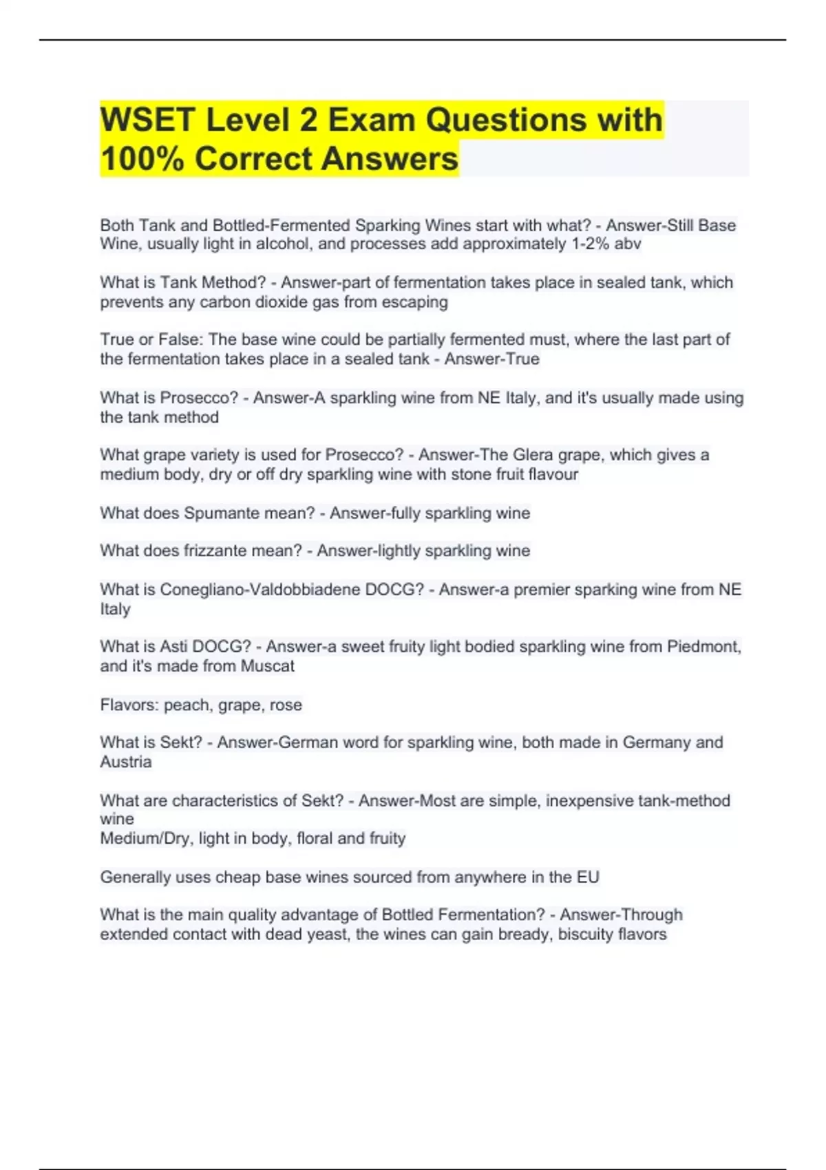 WSET Level 2 Exam Questions with 100% Correct Answers Both Tank and Bottled-Fermented Sparking Wines start with what? - Answer-Still Base Wine, usually light in alcohol, and processes add approximately 1-2% abv What is Tank Method? - Answer-part of fermentation takes place in sealed tank, which prevents any carbon dioxide gas from escaping True or False: The base wine could be partially fermented must, where the last part of the fermentation takes place in a sealed tank - Answer-True What is Prosecco? - Answer-A sparkling wine from NE Italy, and it's usually made using the tank method What grape variety is used for Prosecco? - Answer-The Glera grape, which gives a medium body, dry or off dry sparkling wine with stone fruit flavour What does Spumante mean? - Answer-fully sparkling wine What does frizzante mean? - Answer-lightly sparkling wine What is Conegliano-Valdobbiadene DOCG? - Answer-a premier sparking wine from NE Italy What is Asti DOCG? - Answer-a sweet fruity light bodied sparkling wine from Piedmont, and it's made from Muscat Flavors: peach, grape, rose What is Sekt? - Answer-German word for sparkling wine, both made in Germany and Austria What are characteristics of Sekt? - Answer-Most are simple, inexpensive tank-method wine Medium/Dry, light in body, floral and fruity Generally uses cheap base wines sourced from anywhere in the EU What is the main quality advantage of Bottled Fermentation? - Answer-Through extended contact with dead yeast, the wines can gain bready, biscuity flavors