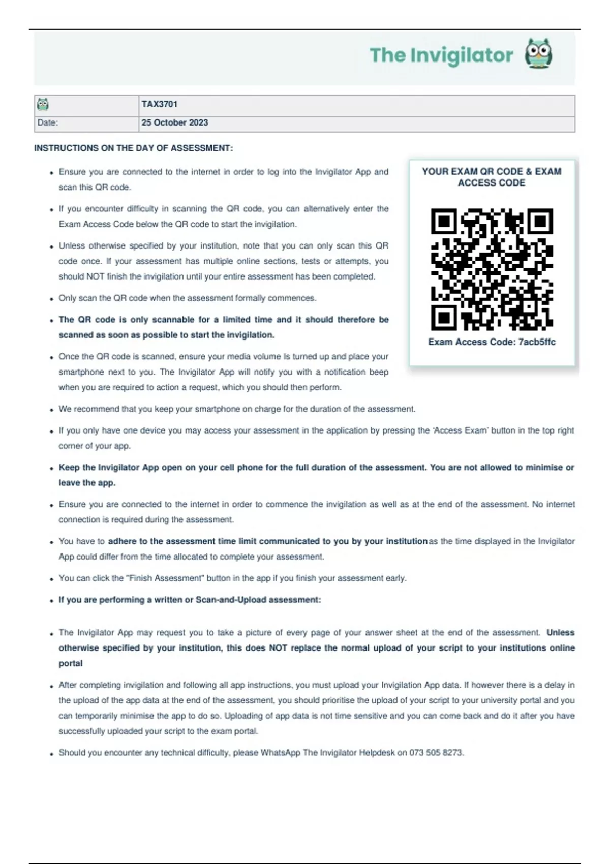Should you encounter any technical difficulty, please WhatsApp The Invigilator Helpdesk on 073 505 8273.