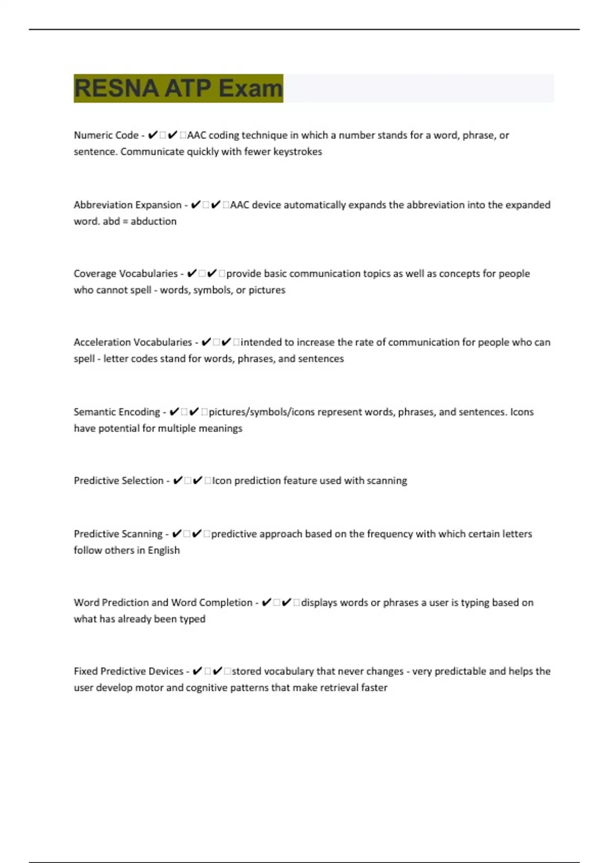 Numeric Code - ️️AAC coding technique in which a number stands for a word, phrase, or sentence. Communicate quickly with fewer keystrokes Abbreviation Expansion - ️️AAC device automatically expands the abbreviation into the expanded word. abd = abduction Coverage Vocabularies - ️️provide basic communication topics as well as concepts for people who cannot spell - words, symbols, or pictures Acceleration Vocabularies - ️️intended to increase the rate of communication for people who can spell - letter codes stand for words, phrases, and sentences Semantic Encoding - ️️pictures/symbols/icons represent words, phrases, and sentences. Icons have potential for multiple meanings Predictive Selection - ️️Icon prediction feature used with scanning Predictive Scanning - ️️predictive approach based on the frequency with which certain letters follow others in English Word Prediction and Word Completion - ️️displays words or phrases a user is typing based on what has already been typed Fixed Predictive Devices - ️️stored vocabulary that never changes - very predictable and helps the user develop motor and cognitive patterns that make retrieval faster