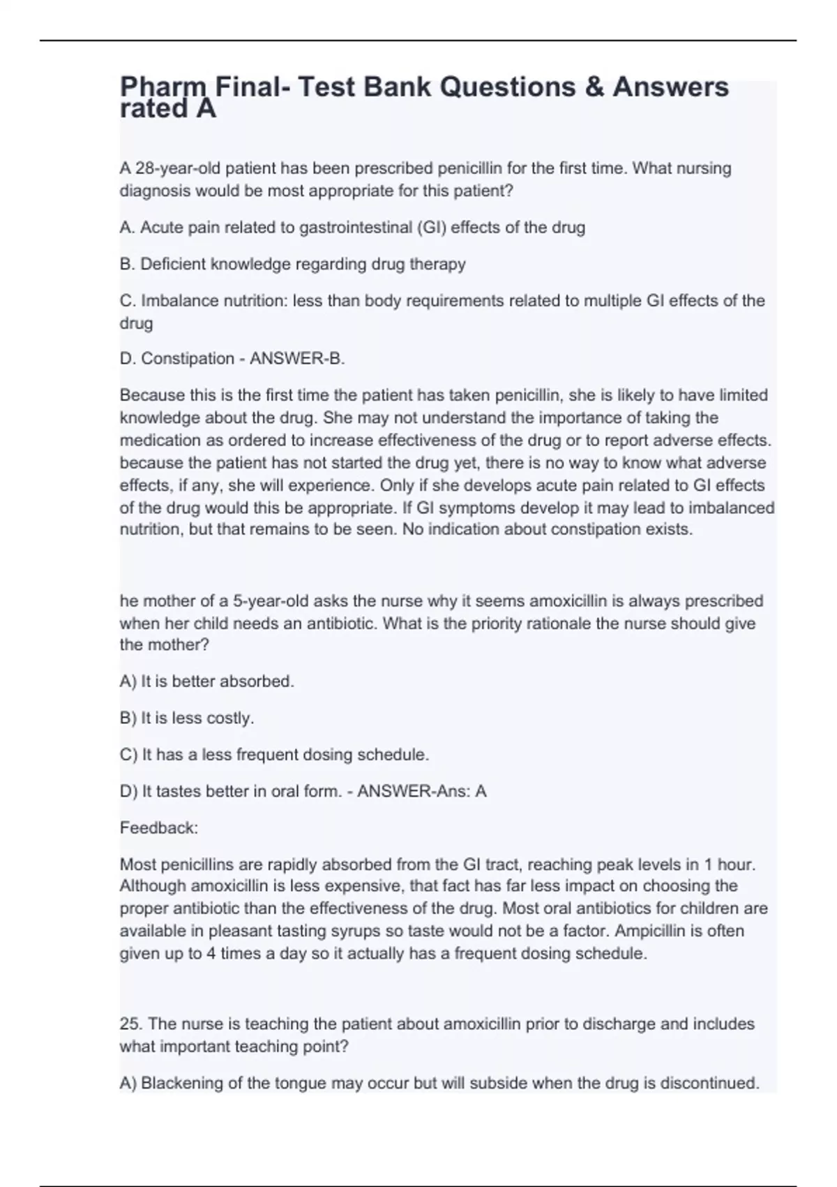 A 28-year-old patient has been prescribed penicillin for the first time. What nursing diagnosis would be most appropriate for this patient? A. Acute pain related to gastrointestinal (GI) effects of the drug B. Deficient knowledge regarding drug therapy C. Imbalance nutrition: less than body requirements related to multiple GI effects of the drug D. Constipation - ANSWER-B. Because this is the first time the patient has taken penicillin, she is likely to have limited knowledge about the drug. She may not understand the importance of taking the medication as ordered to increase effectiveness of the drug or to report adverse effects. because the patient has not started the drug yet, there is no way to know what adverse effects, if any, she will experience. Only if she develops acute pain related to GI effects of the drug would this be appropriate. If GI symptoms develop it may lead to imbalanced nutrition, but that remains to be seen. No indication about constipation exists. he mother of a 5-year-old asks the nurse why it seems amoxicillin is always prescribed when her child needs an antibiotic. What is the priority rationale the nurse should give the mother? A) It is better absorbed. B) It is less costly. C) It has a less frequent dosing schedule. D) It tastes better in oral form. - ANSWER-Ans: A Feedback: Most penicillins are rapidly absorbed from the GI tract, reaching peak levels in 1 hour. Although amoxicillin is less expensive, that fact has far less impact on choosing the proper antibiotic than the effectiveness of the drug. Most oral antibiotics for children are available in pleasant tasting syrups so taste would not be a factor. Ampicillin is often given up to 4 times a day so it actually has a frequent dosing schedule. 25. The nurse is teaching the patient about amoxicillin prior to discharge and includes what important teaching point? A) Blackening of the tongue may occur but will subside when the drug is discontinued. B) Even if it seems like the infection is not improving, the drug is still working. C) Yeast infections are unlikely to occur with this medication because it is narrow spectrum. D) Appearance of a rash is common and does not indicate an allergic reaction. - ANSWER-Ans: A