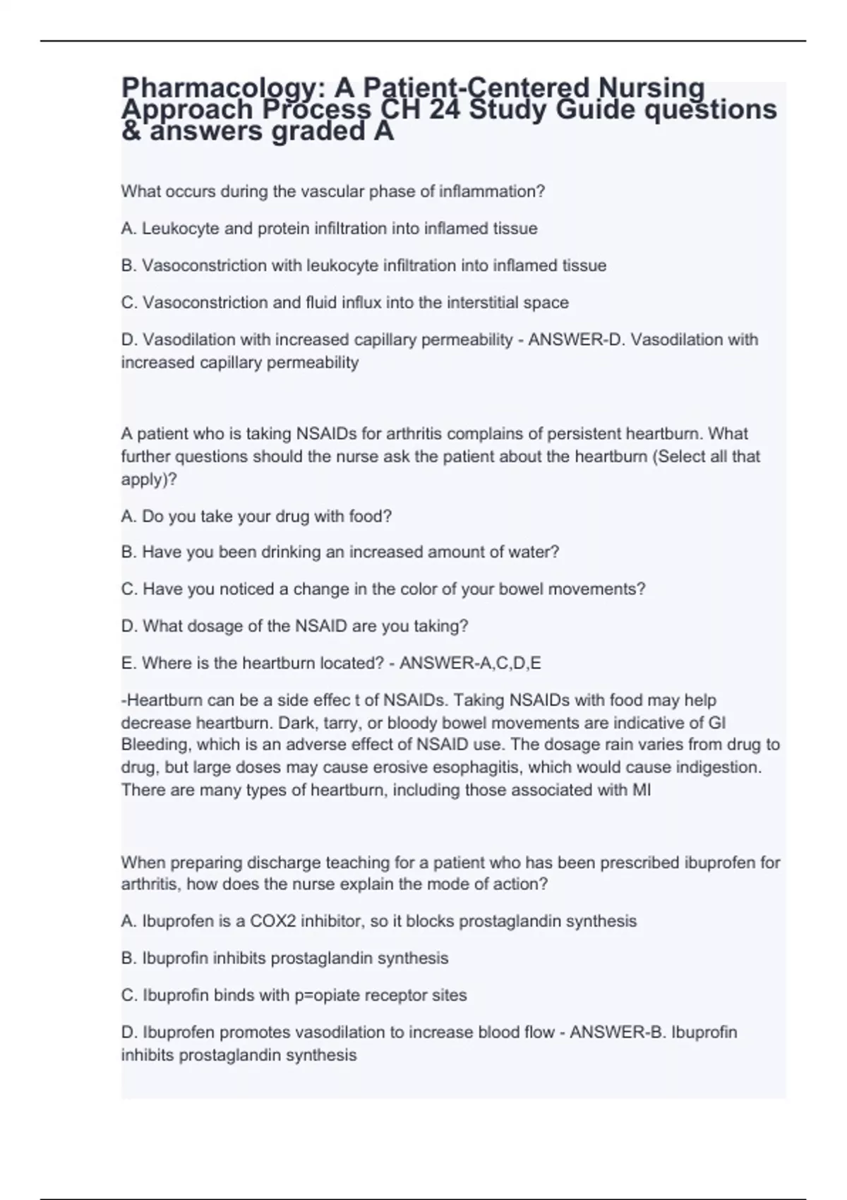 What occurs during the vascular phase of inflammation? A. Leukocyte and protein infiltration into inflamed tissue B. Vasoconstriction with leukocyte infiltration into inflamed tissue C. Vasoconstriction and fluid influx into the interstitial space D. Vasodilation with increased capillary permeability - ANSWER-D. Vasodilation with increased capillary permeability A patient who is taking NSAIDs for arthritis complains of persistent heartburn. What further questions should the nurse ask the patient about the heartburn (Select all that apply)? A. Do you take your drug with food? B. Have you been drinking an increased amount of water? C. Have you noticed a change in the color of your bowel movements? D. What dosage of the NSAID are you taking? E. Where is the heartburn located? - ANSWER-A,C,D,E -Heartburn can be a side effec t of NSAIDs. Taking NSAIDs with food may help decrease heartburn. Dark, tarry, or bloody bowel movements are indicative of GI Bleeding, which is an adverse effect of NSAID use. The dosage rain varies from drug to drug, but large doses may cause erosive esophagitis, which would cause indigestion. There are many types of heartburn, including those associated with MI When preparing discharge teaching for a patient who has been prescribed ibuprofen for arthritis, how does the nurse explain the mode of action? A. Ibuprofen is a COX2 inhibitor, so it blocks prostaglandin synthesis B. Ibuprofin inhibits prostaglandin synthesis C. Ibuprofin binds with p=opiate receptor sites D. Ibuprofen promotes vasodilation to increase blood flow - ANSWER-B. Ibuprofin inhibits prostaglandin synthesis