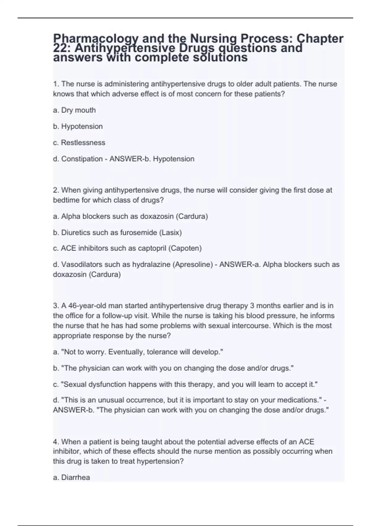 1. The nurse is administering antihypertensive drugs to older adult patients. The nurse knows that which adverse effect is of most concern for these patients? a. Dry mouth b. Hypotension c. Restlessness d. Constipation - ANSWER-b. Hypotension 2. When giving antihypertensive drugs, the nurse will consider giving the first dose at bedtime for which class of drugs? a. Alpha blockers such as doxazosin (Cardura) b. Diuretics such as furosemide (Lasix) c. ACE inhibitors such as captopril (Capoten) d. Vasodilators such as hydralazine (Apresoline) - ANSWER-a. Alpha blockers such as doxazosin (Cardura) 3. A 46-year-old man started antihypertensive drug therapy 3 months earlier and is in the office for a follow-up visit. While the nurse is taking his blood pressure, he informs the nurse that he has had some problems with sexual intercourse. Which is the most appropriate response by the nurse? a. "Not to worry. Eventually, tolerance will develop." b. "The physician can work with you on changing the dose and/or drugs." c. "Sexual dysfunction happens with this therapy, and you will learn to accept it." d. "This is an unusual occurrence, but it is important to stay on your medications." - ANSWER-b. "The physician can work with you on changing the dose and/or drugs."
