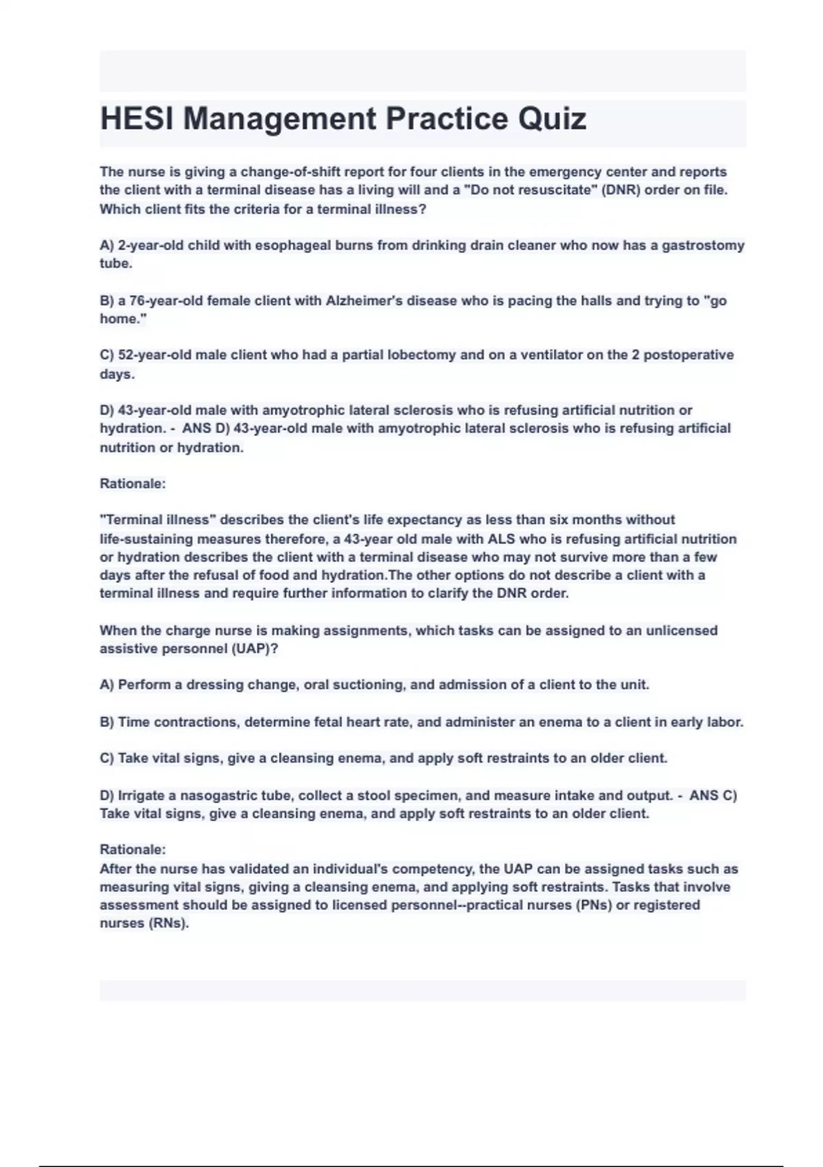 HESI Management Practice Quiz Questions and Answers 2024( A+ GRADED 100% VERIFIED).