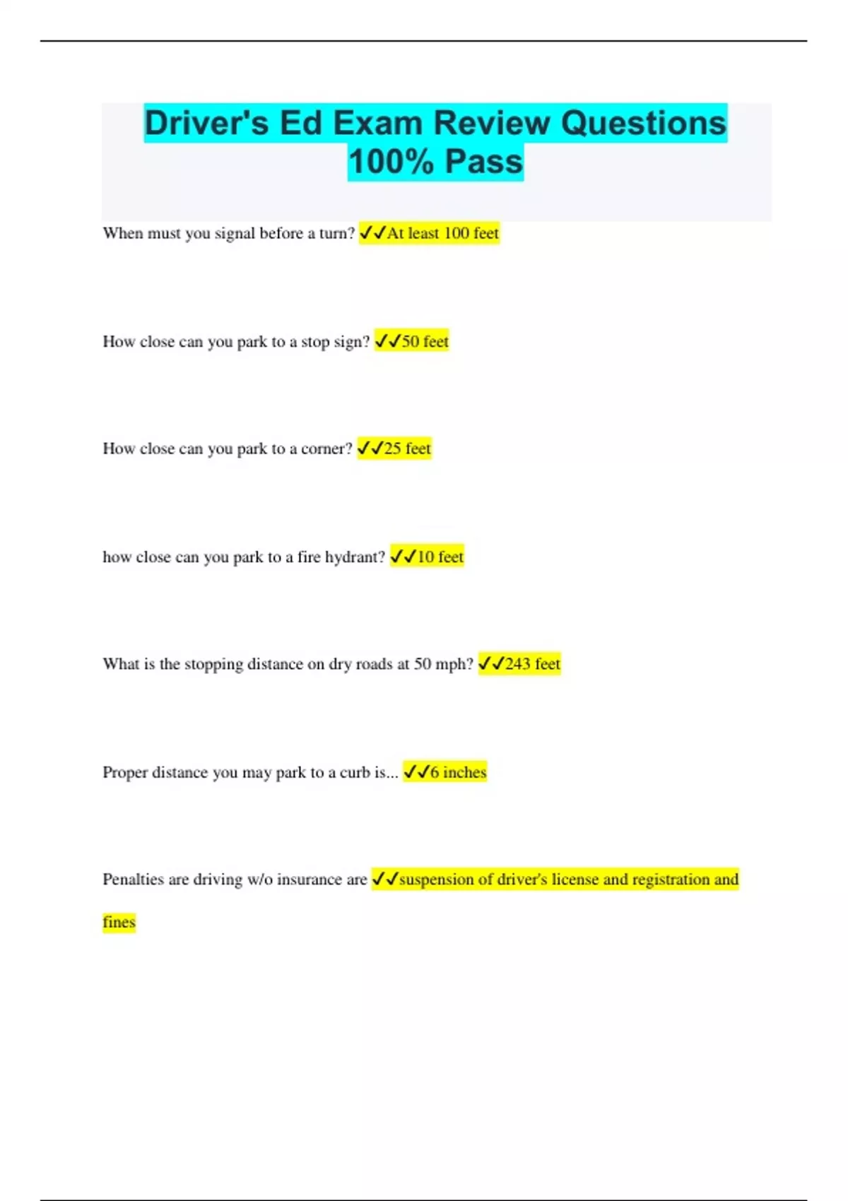 Driver's Ed Exam Review Questions 100% Pass When must you signal before a turn? At least 100 feet How close can you park to a stop sign? 50 feet How close can you park to a corner? 25 feet how close can you park to a fire hydrant? 10 feet What is the stopping distance on dry roads at 50 mph? 243 feet Proper distance you may park to a curb is... 6 inches Penalties are driving w/o insurance are suspension of driver's license and registration and fines Serious accidents causing death/injury/$200 damage must be reported in 5 days to... Division of Motor Vehicles Points are only issued for... moving violations When are you given a proposed License Suspension Notice? When you have received 12 points Penalty for driving with a suspended license... First offense fine of $500 and up to 6 months additional license suspension What is the penalty for not telling the truth when applying for a license? Not less than a $200 fine and/or up to 6 months imprisonment Up to 3 points may be subtracted from your record if you receive no moving violations for how long? One year What is the penalty for refusing to take a breath test? Loss of driving privileges for 7 months-1 year. $1000/year surcharge for 3 years. Who is responsible if a student commits a traffic offense? Both the student and the instructor or licensed driver What should you do when approaching a yellow light? Stop before entering intersection if possible What is good practice while driving? Keep from looking at any one thing for more than a few seconds What is the proper lane to turn into when making a left turn? The lane nearest the center in the direction you are heading When driving at night you should be able to stop how? Within the distance you can see ahead Where should you position the car to make a left turn from a two-way street? The lane nearest the center of the road What is a good practice when nearing an intersection? Slow down and be prepared to stop What is the purpose of traffic laws? To protect you and other drivers If there is a "No turn on red" sign, when can you make a turn on red? After making a full stop and yielding to traffic If you feel or hear and unusual thumping noise while driving it may be? The tires When your car is stranded in a heavy snow storm, you should... stay with your car What is a good practice when driving in the city? Check interections ahead for signals What must you do if you want to turn left at a traffic light? Yield to the oncoming traffic If the front of the car vibrations..the problem may be with you? steering What do two parallel white lines across the road mean pedestrian crosswalk Which lights should you use when driving in fog? low beams What papers must you have when operating a motor vehicle? License, registration, and insurance card When should you use your horn? If you are driving out of an alley What should be done if two cars enter an uncontrolled intersection simultaneously? The driver on the left must yield to the driver on the right Double solid center lines would usually be found where? On a winding two-way road -- no passing Why should you use seat/shoulder belts They increase your chances of surviving an accident When may you pass on the right? If the car in front is turning left and there is a lane for driving on the right What does a flashing red light mean? Stop, proceed with caution What does a green light mean? Proceed when safe What does a single solid white line across an intersection mean? You should stop behind the line for a traffic sign or signal What does a yellow diamond shaped sign mean? Warning or caution When should you use your parking lights? When parking Which way do you turn if you go into a skid? In the direction the back of the car is skidding How far should you stay behind the car you are following? At least 2 seconds What direction should you check first when approaching an intersection? To the left If 2 cars reach a four-way stop at the same time, what is the proper procedure? The driver on the left yields to the driver on the right What should you do if you go into a skid? Take your foot of the gas pedal What is the most common mistake a new driver makes with the brake? pushing the brakes too hard What is the best way to talk to other drivers? Through the use of horn or lights A red eight-sided sign is... Stop sign What does a red and white triangular sign mean? Yield If you drive through a deep puddle what should you do? Test your brakes When is the road surface most slippery? During the first few minutes of rain When should you use your high beam lights? Open country driving situations If the lights of oncoming cars are in your eyes, what should you do? Look to the lower right side of your traffic lane A driver's left hand extended upward means what? He is making a right turn A driver's left hand extended straight out means what? He is making a left turn A driver's left hand extended downward means what? He is making a stop or slowing down The safest way to exit an expressway is to? Slow your car to the posted exit speed What should you do if your electric signals fail to operate? Use hand signals What should you do if you have a blowout? Slow the vehicle gradually What should you do if you are angry or upset? "Cool off" before attempting to drive What should you do if you miss an exist on an expressway? Go on to the next exit; do not reverse or back up When you are driving on a curve, your vehicle will tend to go in what direction? Straight What is a good practice at intersections that have no signs or signals? Be ready to stop if necessary It is a good practice to keep a space cushion to: Give you time to react One of the best defenses against a drunk driver is : Proper wearing of a safety belt When a school bus has stopped at a school to pick up or let off children, you may pass from either direction at a speed of no more than 10 mph What must you do if a school bus is stopped and its red light is flashing? Stop How should you turn your wheels when 