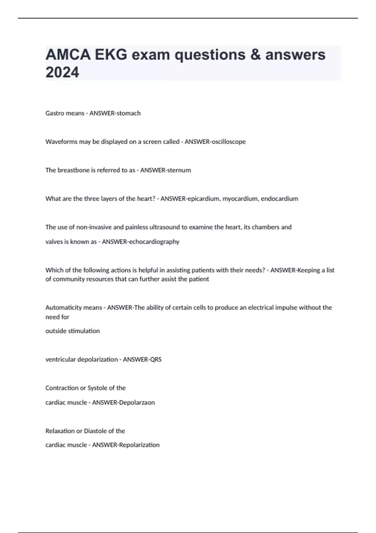 AMCA EKG exam questions & answers 2024 Gastro means - ANSWER-stomach Waveforms may be displayed on a screen called - ANSWER-oscilloscope The breastbone is referred to as - ANSWER-sternum What are the three layers of the heart? - ANSWER-epicardium, myocardium, endocardium The use of non-invasive and painless ultrasound to examine the heart, its chambers and valves is known as - ANSWER-echocardiography Which of the following actions is helpful in assisting patients with their needs? - ANSWER-Keeping a list of community resources that can further assist the patient Automaticity means - ANSWER-The ability of certain cells to produce an electrical impulse without the need for outside stimulation ventricular depolarization - ANSWER-QRS Contraction or Systole of the cardiac muscle - ANSWER-Depolarzaon Relaxation or Diastole of the cardiac muscle - ANSWER-Repolarization