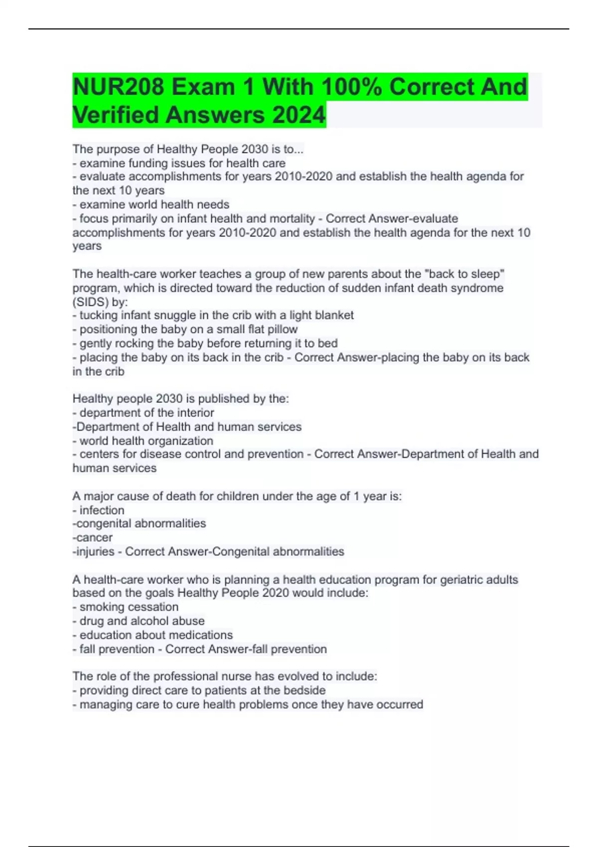 nur208 exam 1 with 100 correct and verified answe