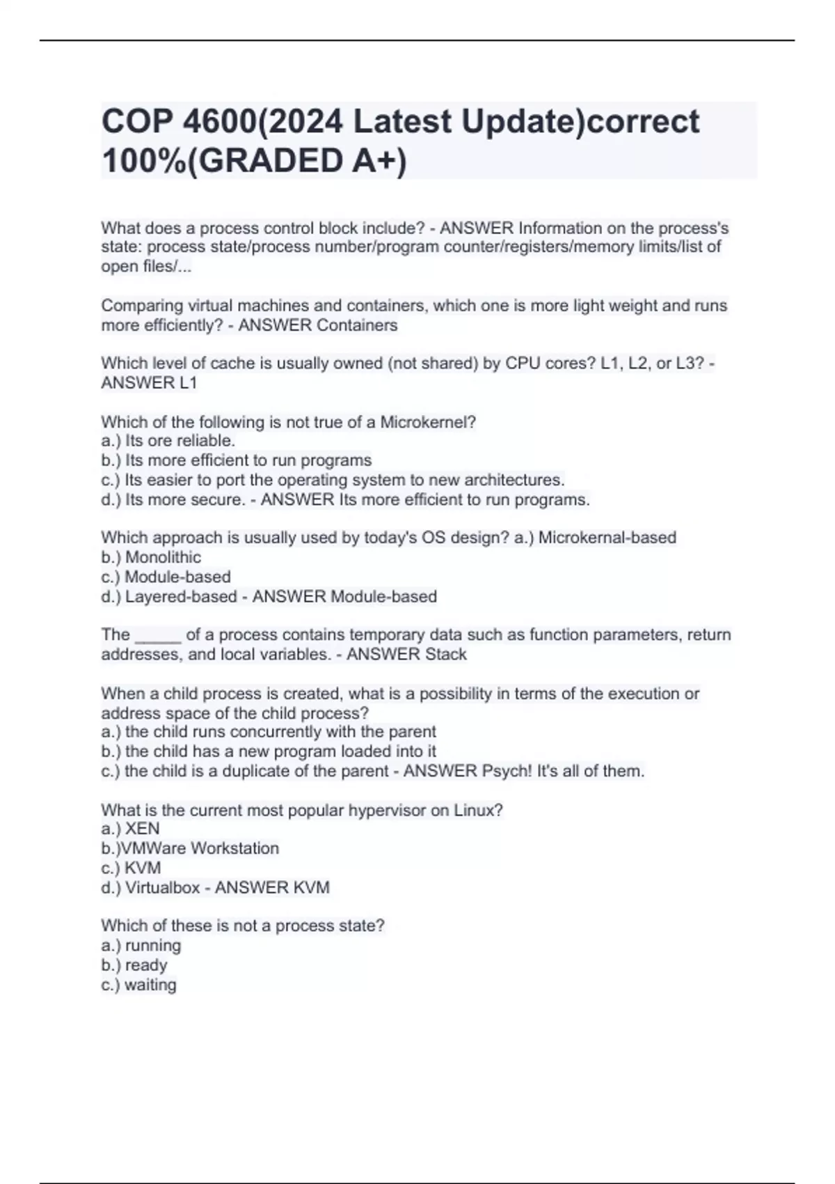 What does a process control block include? - ANSWER Information on the process's state: process state/process number/program counter/registers/memory limits/list of open files/... Comparing virtual machines and containers, which one is more light weight and runs more efficiently? - ANSWER Containers Which level of cache is usually owned (not shared) by CPU cores? L1, L2, or L3? - ANSWER L1 Which of the following is not true of a Microkernel? a.) Its ore reliable. b.) Its more efficient to run programs c.) Its easier to port the operating system to new architectures. d.) Its more secure. - ANSWER Its more efficient to run programs. Which approach is usually used by today's OS design? a.) Microkernal-based b.) Monolithic c.) Module-based d.) Layered-based - ANSWER Module-based The _____ of a process contains temporary data such as function parameters, return addresses, and local variables. - ANSWER Stack When a child process is created, what is a possibility in terms of the execution or address space of the child process? a.) the child runs concurrently with the parent b.) the child has a new program loaded into it c.) the child is a duplicate of the parent - ANSWER Psych! It's all of them. What is the current most popular hypervisor on Linux? a.) XEN b.)VMWare Workstation c.) KVM d.) Virtualbox - ANSWER KVM Which of these is not a process state? a.) running b.) ready c.) waiting d.) sleeping - ANSWER Sleeping The list of processes waiting for a particular I/O device is called a(n) ____. - ANSWER device queue Which is true of a message passing model? a.) It's only useful for small, simple OSs b.) It's easier to implement than a shared memory model for intercomputer communication c.) It's faster than the shared memory model d.) It's a network protocol and does not apply to OSs - ANSWER It's easier to implement than a shared memory model for intercomputer communication The major difficulty in designing a layered operating system approach is... a.) Making sure each layer is easily converted to modules. b.) Debugging a particular layer. c.) Appropriately defining the various layers. - ANSWER Appropriately defining the various layers. Which of the following is true of a microkernel? a.) It's stripped of all nonessential components. b.) It's compiled to produce the smallest size possible when stored to a disk. c.) It contains many components that are optimized to reduce resident memory size. d.) It's compressed before lading in order to reduce its resident memory size. - ANSWER It's stripped of all nonessential components. Which of the following is not a benefit of virtual machines? a.) It protects the host system from guest OSs b.) It has the ability to run several different operating systems that all share the same hardware. c.) It uses less physical memory than an actual OS d.) It has the ability to concurrently run several different OSs - ANSWER It uses less physical memory than an actual OS Through which of the following can you NOT pass parameters from an application to a system call? a.) Cache memory b.) Registers c.) Stack d.) Special block in memory. - ANSWER Cache memory Which of the following provides an interface to the services provided by an OS? a.) Shared memory b.) Communication c.) System calls d.) Simulators - ANSWER System calls Which of the following is true of a spinlock? a.) It will ultimately result in a context switch when a process must wait on a lock. b.) It does not require a context switch when a process must wait on a lock. c.) It is useful when locks are expected to be held for long amounts of time. d.) It is never advantageous. - ANSWER It does not require a context switch when a process must wait on a lock. When a process creates a new process using the fork() operation, which of the following state is shared between the parent process and the child process? a.) Stack b.) Heap c.) Shared memory segments d.) Global variables. - ANSWER Shared memory segments T/F: Multi-threading can also improve software performance (speed) when running on a single-core CPU. - ANSWER True What kind of multithreading model multiplexes many user-level threads to a smaller or equal number of kernel threads? - ANSWER Many-to-Many How many processes will be generated in the following code? f