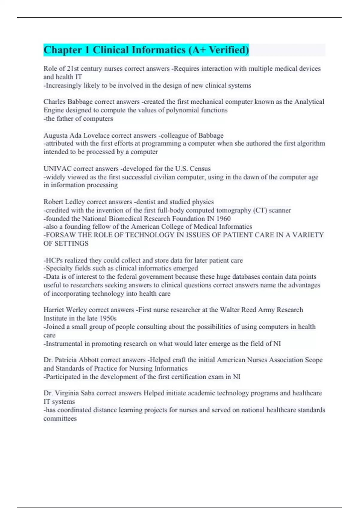 Role of 21st century nurses correct answers -Requires interaction with multiple medical devices and health IT -Increasingly likely to be involved in the design of new clinical systems Charles Babbage correct answers -created the first mechanical computer known as the Analytical Engine designed to compute the values of polynomial functions -the father of computers Augusta Ada Lovelace correct answers -colleague of Babbage -attributed with the first efforts at programming a computer when she authored the first algorithm intended to be processed by a computer UNIVAC correct answers -developed for the U.S. Census -widely viewed as the first successful civilian computer, using in the dawn of the computer age in information processing Robert Ledley correct answers -dentist and studied physics -credited with the invention of the first full-body computed tomography (CT) scanner -founded the National Biomedical Research Foundation IN 1960 -also a founding fellow of the American College of Medical Informatics -FORSAW THE ROLE OF TECHNOLOGY IN ISSUES OF PATIENT CARE IN A VARIETY OF SETTINGS -HCPs realized they could collect and store data for later patient care -Specialty fields such as clinical informatics emerged -Data is of interest to the federal government because these huge databases contain data points useful to researchers seeking answers to clinical questions correct answers name the advantages of incorporating technology into health care Harriet Werley correct answers -First nurse researcher at the Walter Reed Army Research Institute in the late 1950s -Joined a small group of people consulting about the possibilities of using computers in health care -Instrumental in promoting research on what would later emerge as the field of NI Dr. Patricia Abbott correct answers -Helped craft the initial American Nurses Association Scope and Standards of Practice for Nursing Informatics -Participated in the development of the first certification exam in NI Dr. Virginia Saba correct answers Helped initiate academic technology programs and healthcare IT systems -has coordinated distance learning projects for nurses and served on national healthcare standards committees