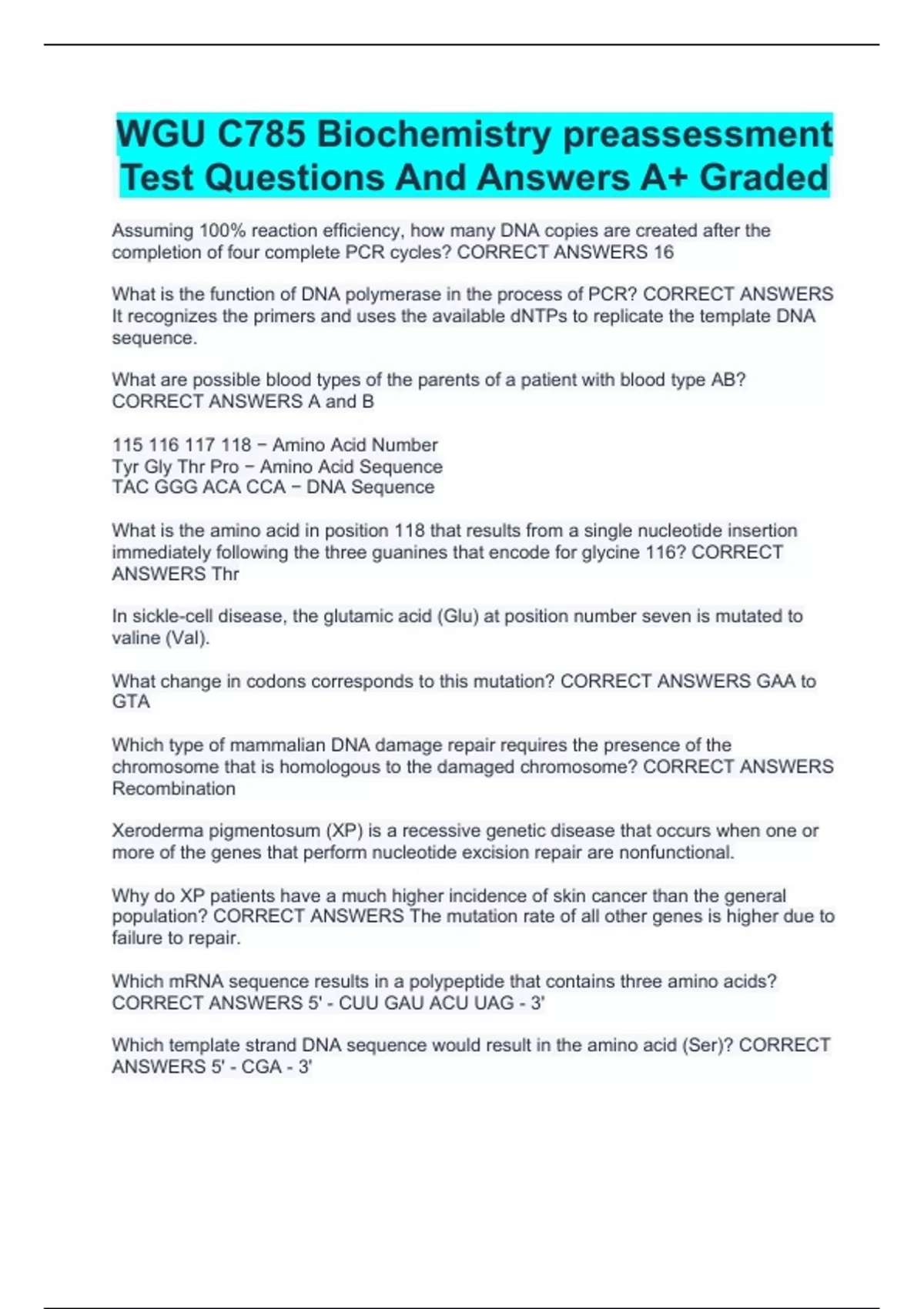 WGU C785 Biochemistry preassessment Test Questions And Answers A+ Graded