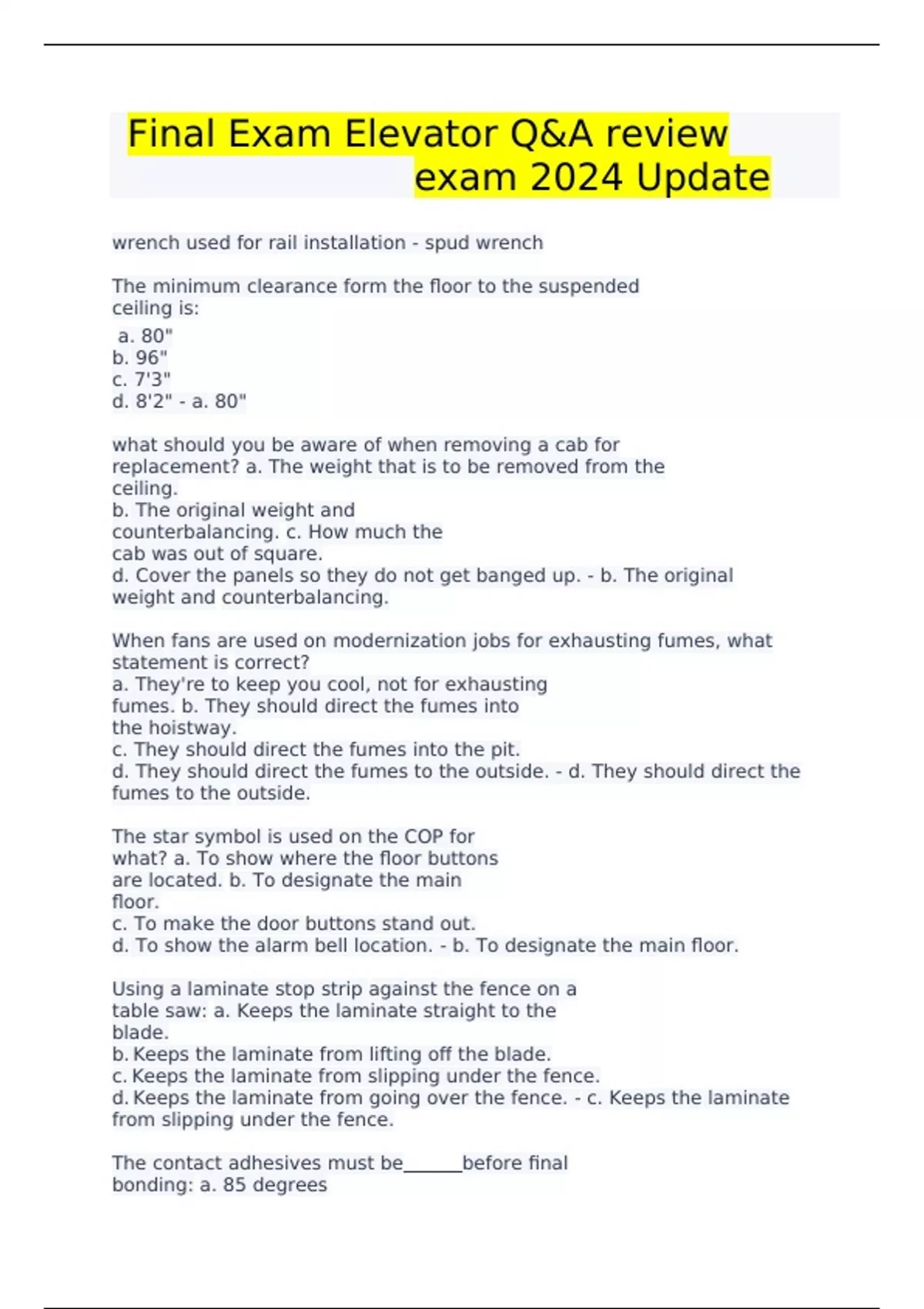 Final Exam Elevator Q&A review exam 2024 Update wrench used for rail installation - spud wrench The minimum clearance form the floor to the suspended ceiling is: a. 80" b. 96" c. 7'3" d. 8'2" - a. 80" what should you be aware of when removing a cab for replacement? a. The weight that is to be removed from the ceiling. b. The original weight and counterbalancing. c. How much the cab was out of square. d. Cover the panels so they do not get banged up. - b. The original weight and counterbalancing. When fans are used on modernization jobs for exhausting fumes, what statement is correct? a. They're to keep you cool, not for exhausting fumes. b. They should direct the fumes into the hoistway. c. They should direct the fumes into the pit. d. They should direct the fumes to the outside. - d. They should direct the fumes to the outside. The star symbol is used on the COP for what? a. To show where the floor buttons are located. b. To designate the main floor. c. To make the door buttons stand out. d. To show the alarm bell location. - b. To designate the main floor. Using a laminate stop strip against the fence on a table saw: a. Keeps the laminate straight to the blade. b. Keeps the laminate from lifting off the blade. c. Keeps the laminate from slipping under the fence. d. Keeps the laminate from going over the fence. - c. Keeps the laminate from slipping under the fence. The contact adhesives must be before final bonding: a. 85 degrees b. Dry c. Wet to touch d. Cold - b. Dry What is the most important piece of equipment you have when using a power saw? a. Combination blade b. Safety glasses c. Wood rule d. Framing square - b. safety glasses When using a circular saw, which of the following is correct? a. Never start the cut until the blade is turning full RPM b. The base is not adjustable for cutting depth c. Circular saw blades range from 10 to 16 inches d. Remove the retractable guard before cutting - a. Never start the cut until the blade is turning full RPM What is used to make crosscuts on a table saw? a. Push stick b. Rip fence c. Miter gauge d. Larger Blade - c. Miter saw When making crosscuts with a radial arm saw which statement is correct? a. Push the wood slowly into the blade. b. Restrain the blade from moving too fast. c. Rotate and lock the blade parallel to the guide. d. Adjust the blade 1/4" above to cutting surface - b. Restrain the blade from moving too fast What are the two things a compound mitre saw does best at the same time? a. moving it around and setting it up is fast. b. You can cut left and right at the same time. c. Tilting the blade 45 degrees and pivoting the table 45 degrees gives you a 90 degree square cut. d. bevel and mitre cuts can be made at the same time - d. bevel and mitre cuts can be made at the same time Why do we use laminated glass in the walls of glass elevator cabs? a. if the glass breaks you can get a replacement at the hardware store. b. if the glass cracks the plastic interlayer holds the fragments c. it is made in a variety of colors d. it is easy to handle and installs quickly - b. if the glass cracks the plastic interlayer holds the fragments Which of the following is NOT a step in preparing the walls before hanging panels? a. check walls for square and plumb b. mount handrails on the walls where the panels will be installed. c. clean surfaces and fill all holes not being used d. preheat walls as per specifications - b. mount handrails on the walls where the panels will be installed When installing a resilient tile floor covering, there should be a layer of between the underlayment and the tiles. a. plywood b. grout c. 15lb asphalt paper d. tile separators - c. 15 lb asphalt paper While similar to laying resilient floor tiles, ceramic tiles require the additional steps of: a. grouting and sealing b. stress testing and certification c. glazing and firing d. marking and cutting - a. grouting and sealing Once you are satisfied with the layout of the tiles after a dry layout, remove them and a. stack them neatly in a location near the entrance b. adhere adjoining tile edges so the floor pattern won't be lost c. test each tile for durability d. lay them out in an adjacent area to maintain the floor pattern correctly. - d.d lay them out in an adjacent area to maintain the floor pattern correctly For carpet installation, if the cab area measures 94 inches by 62 inches and you need an extra six inches added to each dimension to account for waste during cutting, how many square yards of carpet do you need for this job? a. 6.25 b. 6 c. 5.5 d. 5.25 - d. 5.25 if suspended glass is used with lighting fixtures, the fixture must be a. positioned in the center of the dropped ceiling b. concealed behind a metal grid c. supported by a metal frame and securely fastened by at least 3 points d. flush with the surface of the ceiling - c. supported by a metal frame and securely fastened by at least 3 points all cab modernization should be performed at what floor? a. at the main lobby b. bottom floor c. top floor d. lowest landing - c. top floor to meed A.D.A. requirements, hall call buttons are centered at above the finished floor. a. 36" b. 42" c. 48" d. 52" - b. 42" IF you had a 14,500 lb machine to lift up the hoistway, what kind of reeving would be used for a 4000lb capacity portable gas hoist? a. 2:1 b. 3:1 c. 4:1 d. 5:1 - c. 4:1 WHich of the following statements best describes the gearless traction machine? a. this type of machine does not use any gears other than reduction gears b. the gearless machine is comprised of a drive sheave, worm shaft and a brake. c. This type of machine uses slow speed DC motors d. The gearless machine is limited to mid-rise elevator installations - c. this type of machine uses slow speed DC motors what is the correct minimum diameter of any sheave or drum in contact with hoist rope? a. 20x the diameter of the rope b. 40x the diameter of the rope c. no minimum is required if the ropes are slung over a deflector sheave d. no minimu