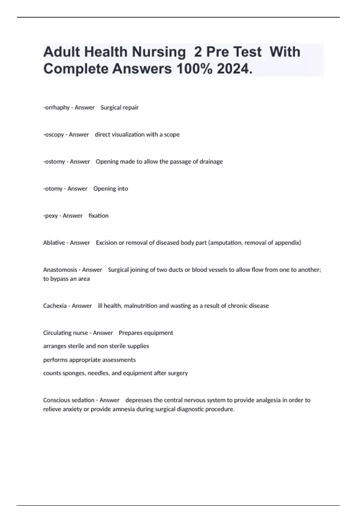 -orrhaphy - Answer Surgical repair -oscopy - Answer direct visualization with a scope -ostomy - Answer Opening made to allow the passage of drainage -otomy - Answer Opening into -pexy - Answer fixation Ablative - Answer Excision or removal of diseased body part (amputation, removal of appendix) Anastomosis - Answer Surgical joining of two ducts or blood vessels to allow flow from one to another; to bypass an area Cachexia - Answer ill health, malnutrition and wasting as a result of chronic disease Circulating nurse - Answer Prepares equipment arranges sterile and non sterile supplies performs appropriate assessments counts sponges, needles, and equipment after surgery Conscious sedation - Answer depresses the central nervous system to provide analgesia in order to relieve anxiety or provide amnesia during surgical diagnostic procedure.