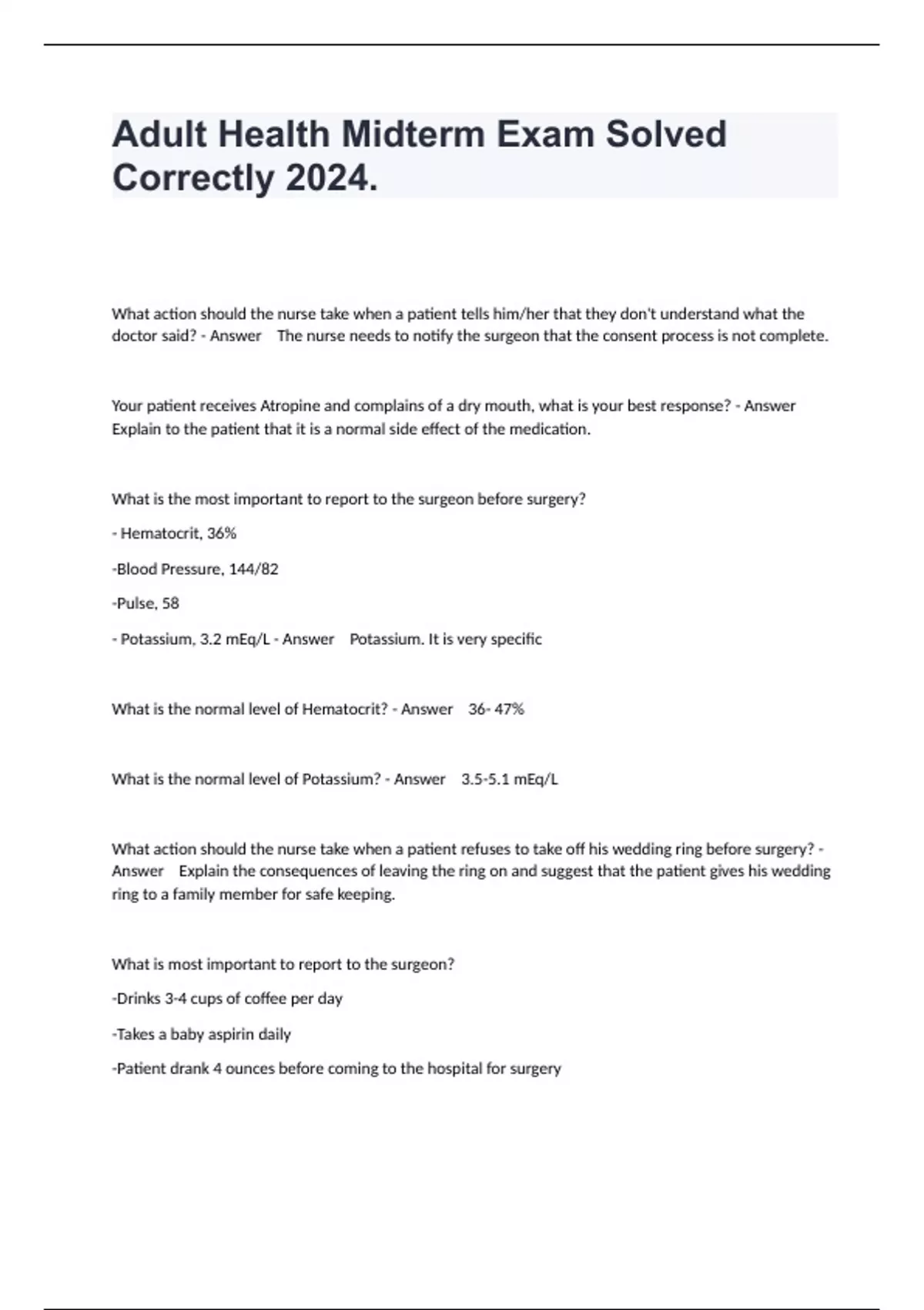 What action should the nurse take when a patient tells him/her that they don't understand what the doctor said? - Answer The nurse needs to notify the surgeon that the consent process is not complete. Your patient receives Atropine and complains of a dry mouth, what is your best response? - Answer Explain to the patient that it is a normal side effect of the medication. What is the most important to report to the surgeon before surgery? - Hematocrit, 36% -Blood Pressure, 144/82 -Pulse, 58 - Potassium, 3.2 mEq/L - Answer Potassium. It is very specific What is the normal level of Hematocrit? - Answer 36- 47% What is the normal level of Potassium? - Answer 3.5-5.1 mEq/L What action should the nurse take when a patient refuses to take off his wedding ring before surgery? - Answer Explain the consequences of leaving the ring on and suggest that the patient gives his wedding ring to a family member for safe keeping. What is most important to report to the surgeon? -Drinks 3-4 cups of coffee per day -Takes a baby aspirin daily -Patient drank 4 ounces before coming to the hospital for surgery
