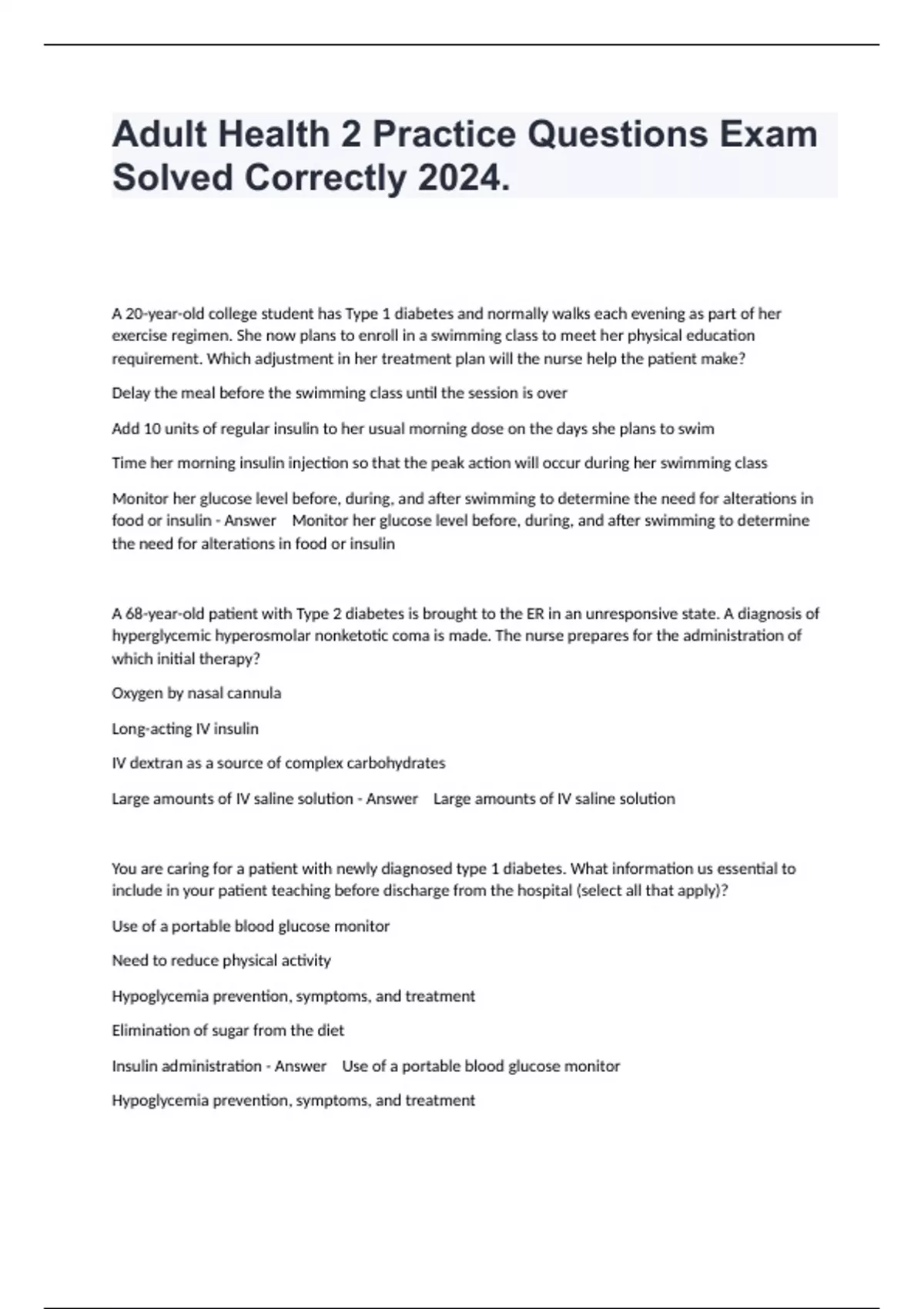 A 20-year-old college student has Type 1 diabetes and normally walks each evening as part of her exercise regimen. She now plans to enroll in a swimming class to meet her physical education requirement. Which adjustment in her treatment plan will the nurse help the patient make? Delay the meal before the swimming class until the session is over Add 10 units of regular insulin to her usual morning dose on the days she plans to swim Time her morning insulin injection so that the peak action will occur during her swimming class Monitor her glucose level before, during, and after swimming to determine the need for alterations in food or insulin - Answer Monitor her glucose level before, during, and after swimming to determine the need for alterations in food or insulin A 68-year-old patient with Type 2 diabetes is brought to the ER in an unresponsive state. A diagnosis of hyperglycemic hyperosmolar nonketotic coma is made. The nurse prepares for the administration of which initial therapy? Oxygen by nasal cannula Long-acting IV insulin IV dextran as a source of complex carbohydrates Large amounts of IV saline solution - Answer Large amounts of IV saline solution You are caring for a patient with newly diagnosed type 1 diabetes. What information us essential to include in your patient teaching before discharge from the hospital (select all that apply)? Use of a portable blood glucose monitor Need to reduce physical activity Hypoglycemia prevention, symptoms, and treatment Elimination of sugar from the diet Insulin administration - Answer Use of a portable blood glucose monitor Hypoglycemia prevention, symptoms, and treatment
