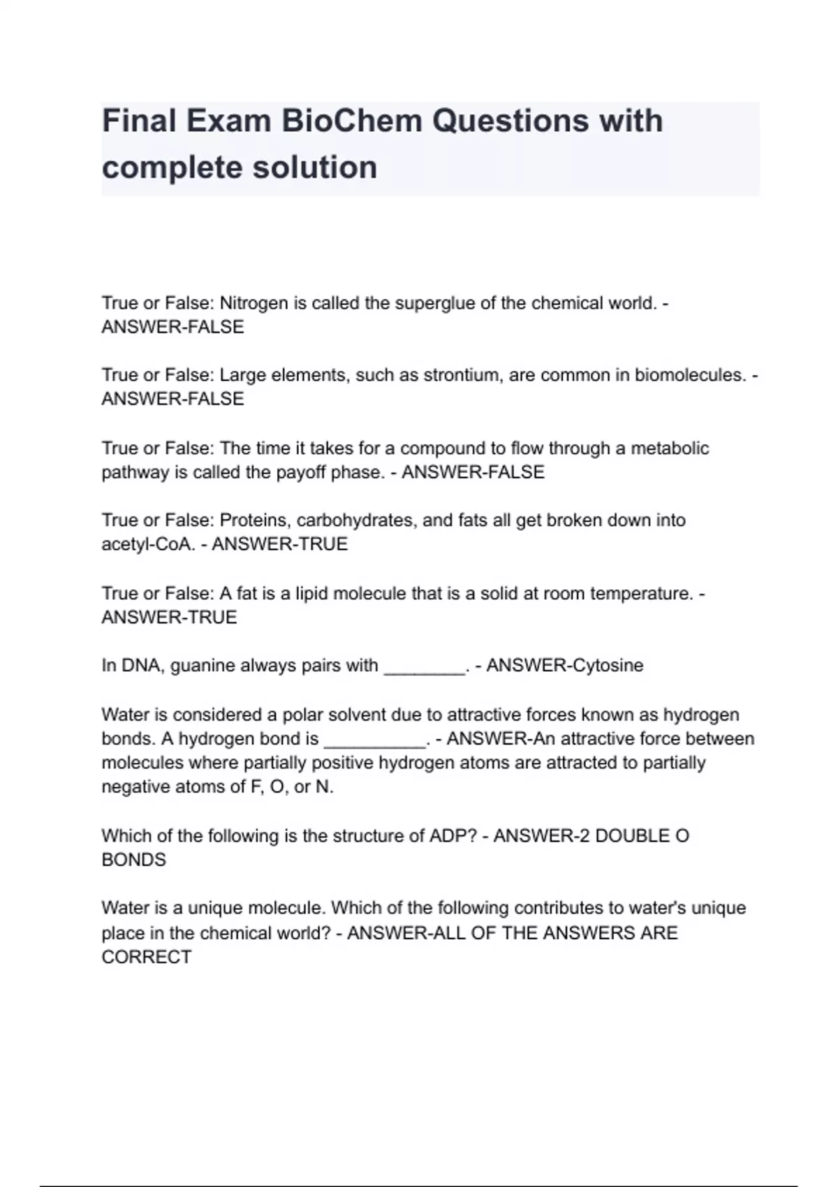 Final Exam BioChem Questions with complete solution Final Exam BioChem Questions with complete solution