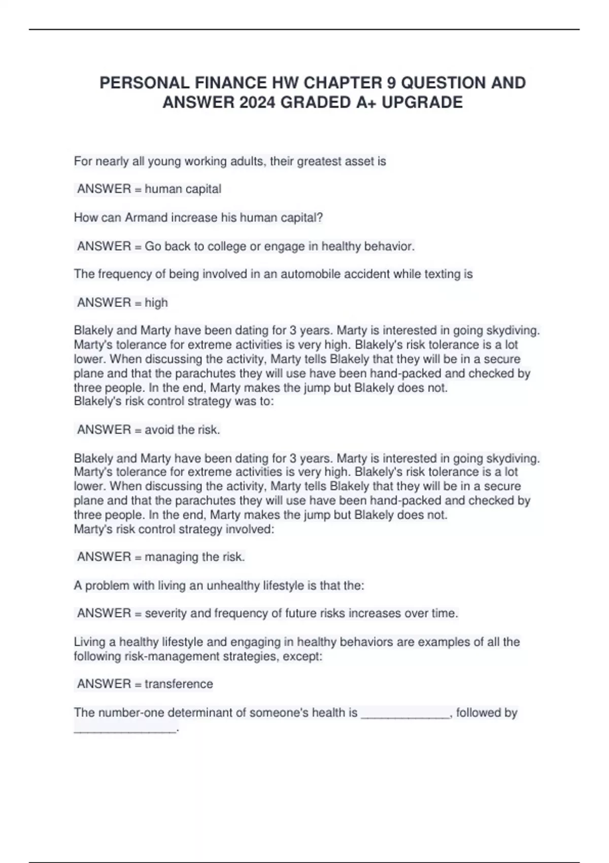PERSONAL FINANCE HW CHAPTER 9 QUESTION AND ANSWER 2024 GRADED A+ UPGRADE For nearly all young working adults, their greatest asset is ANSWER = human capital How can Armand increase his human capital? ANSWER = Go back to college or engage in healthy behavior. The frequency of being involved in an automobile accident while texting is ANSWER = high Blakely and Marty have been dating for 3 years. Marty is interested in going skydiving. Marty's tolerance for extreme activities is very high. Blakely's risk tolerance is a lot lower. When discussing the activity, Marty tells Blakely that they will be in a secure plane and that the parachutes they will use have been hand-packed and checked by three people. In the end, Marty makes the jump but Blakely does not. Blakely's risk control strategy was to: ANSWER = avoid the risk. Blakely and Marty have been dating for 3 years. Marty is interested in going skydiving. Marty's tolerance for extreme activities is very high. Blakely's risk tolerance is a lot lower. When discussing the activity, Marty tells Blakely that they will be in a secure plane and that the parachutes they will use have been hand-packed and checked by three people. In the end, Marty makes the jump but Blakely does not. Marty's risk control strategy involved: ANSWER = managing the risk. A problem with living an unhealthy lifestyle is that the: ANSWER = severity and frequency of future risks increases over time. Living a healthy lifestyle and engaging in healthy behaviors are examples of all the following risk-management strategies, except: ANSWER = transference The number-one determinant of someone's he