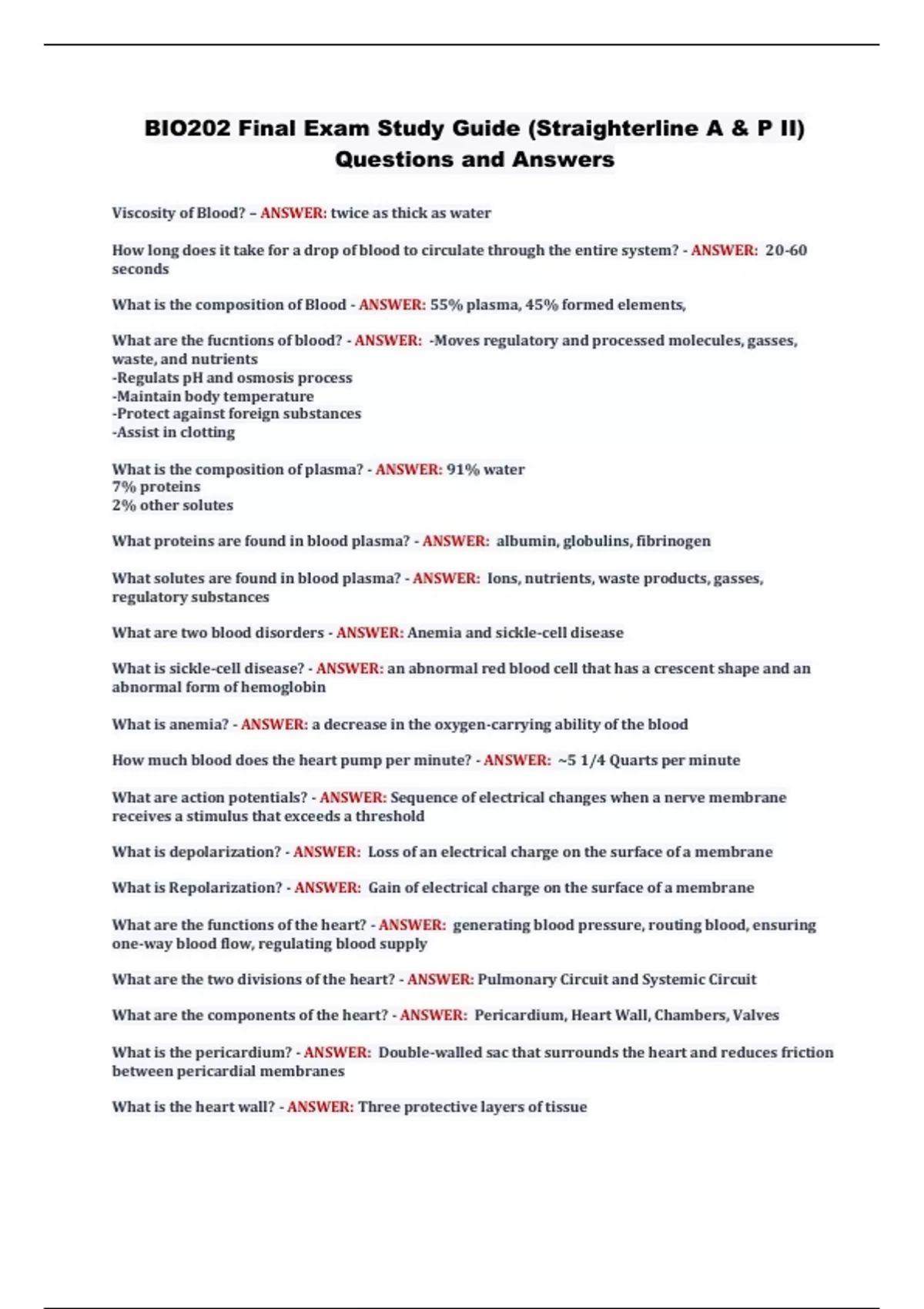 BIO202 Final Exam Study Guide (Straighterline A & P II) Questions and Answers Viscosity of Blood? – ANSWER: twice as thick as water How long does it take for a drop of blood to circulate through the entire system? - ANSWER: 20-60 seconds What is the composition of Blood - ANSWER: 55% plasma, 45% formed elements, What are the fucntions of blood? - ANSWER: -Moves regulatory and processed molecules, gasses, waste, and nutrients -Regulats pH and osmosis process -Maintain body temperature -Protect against foreign substances -Assist in clotting What is the composition of plasma? - ANSWER: 91% water 7% proteins 2% other solutes What proteins are found in blood plasma? - ANSWER: albumin, globulins, fibrinogen What solutes are found in blood p lasma? - ANSWER: Ions, nutrients, waste products, gasses, regulatory substances What are two blood disorders - ANSWER: Anemia and sickle -cell disease What is sickle -cell disease? - ANSWER: an abnormal red blood cell that has a crescent shape and an abno rmal form of hemoglobin What is anemia? - ANSWER: a decrease in the oxygen -carrying ability of the blood How much blood does the heart pump per minute? - ANSWER: ~5 1/4 Quarts per minute What are action potentials? - ANSWER: Sequence of electrical changes when a nerve membrane receives a stimulus that exceeds a threshold What is depolarization? - ANSWER: Loss of an electrical charge on the surface of a membrane What is Repolarization? - ANSWER: Gain of electrical charge on the surface of a membr ane What are the functions of the heart? - ANSWER: generating blood pressure, routing blood, ensuring one -way blood flow, regulating blood supply What are the two divisions of the heart? - ANSWER: Pulmonary Circuit and Systemic Circuit What are the com ponents of the heart? - ANSWER: Pericardium, Heart Wall, Chambers, Valves What is the pericardium? - ANSWER: Double -walled sac that surrounds the heart and reduces friction between pericardial membranes What is the heart wall? - ANSWER: Three protectiv e layers of tissue What to chambers of the heart do? - ANSWER: Receive and return blood from and to the body What is the purpose of heart valves? - ANSWER: prevent back flow of blood, ensure one -directional What are the four valves of the heart? - ANSWER: The tricuspid and pulmonary valves on the right side, and the mitral and aortic valves on the left side. Blood flow through the heart - SVC --> Rt atria --> Tricuspid --> Rt ventricle --> Pulmonic valve --> Lungs --> Lt atria --> Mitral valve --> Lt ventricle --> aortic valve --> aorta --> Body Arteries - ANSWER: carry blood away from the heart, muscular and elastic Veins - ANSWER: Blood vessels that carry blood back to the heart Capillaries - ANSWER: Microscopic vessel through which exchanges take place between the blood and cells of the body Pulmonary hypertension - ANSWER: Narrowed arteries in lungs and heart decrease blood flow from heart and decrease oxygen from lungs to rest of body components of lymphatic system - ANSWER: lymph, lymphatic vessels, lymphatic tissue, lymphatic organs What is lymph? - ANSWER: watery fluid contained in lymphatic vessels that contains white blood cells and antibodies What are lymphatic vessels? - ANSWER: Thinner than veins and continuously filter cellular waste from the extracellular fluid by circulating it through lymph nodes What are the lymphatic tissue types? - ANSWER: Lymphocytes, Macrophages, Dendritic Cells, Reticular Cells What are lymphocytes? - ANSWER: White blood cells found in lymph, blood, etc.m and provide immunity. They originate in bone marrow. What are the two lymphocytes? - ANSWER: B cells and T cells What are B cells? - ANSWER: Lymphocytes that produce antibodies What are T cells? - ANSWER: a lymphocyte of a type produced or processed by the thymus gland and actively participating in the immune response. What are macrophages? - ANSWER: They are big eaters that engulf debris, foreign materials, bacteria, and viruses. What are dendrit ic cells? - ANSWER: Antigen presenting cells located in the, epidermis, mucus membrane and lymphatic organs What are reticular cells? - ANSWER: fibroblasts covering and secreting the fiber network What are the lymphatic organs? - ANSWER: red bone marrow, thymus, lymph nodes, tonsils, spleen What are the functions of the lymphatic system? - ANSWER: fluid balance, fat absorption, defense