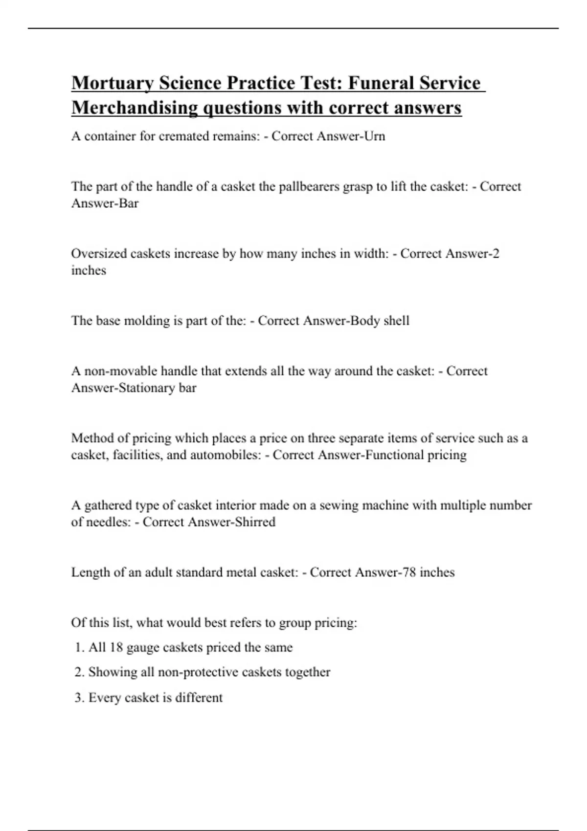 A container for cremated remains: - Correct Answer-Urn The part of the handle of a casket the pallbearers grasp to lift the casket: - Correct Answer-Bar Oversized caskets increase by how many inches in width: - Correct Answer-2 inches The base molding is part of the: - Correct Answer-Body shell A non-movable handle that extends all the way around the casket: - Correct Answer-Stationary bar Method of pricing which places a price on three separate items of service such as a casket, facilities, and automobiles: - Correct Answer-Functional pricing A gathered type of casket interior made on a sewing machine with multiple number of needles: - Correct Answer-Shirred Length of an adult standard metal casket: - Correct Answer-78 inches Of this list, what would best refers to group pricing: 1. All 18 gauge caskets priced the same 2. Showing all non-protective caskets together 3. Every casket is different