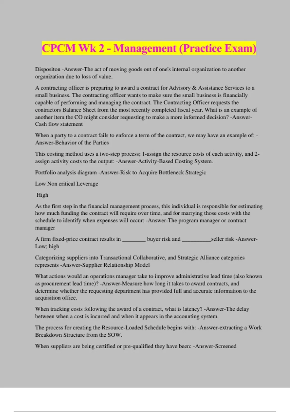 CPCM Wk 2 - Management (Practice Exam) Dispositon -Answer-The act of moving goods out of one's internal organization to another organization due to loss of value. A contracting officer is preparing to award a contract for Advisory & Assistance Services to a small business. The contracting officer wants to make sure the small business is financially capable of performing and managing the contract. The Contracting Officer requests the contractors Balance Sheet from the most recently completed fiscal year. What is an example of another item the CO might consider requesting to make a more informed decision? -Answer- Cash flow statement When a party to a contract fails to enforce a term of the contract, we may have an example of: - Answer-Behavior of the Parties This costing method uses a two-step process; 1-assign the resource costs of each activity, and 2- assign activity costs to the output: -Answer-Activity-Based Costing System. Portfolio analysis diagram -Answer-Risk to Acquire Bottleneck Strategic Low Non critical Leverage High As the first step in the financial management process, this individual is responsible for estimating how much funding the contract will require over time, and for marrying those costs with the schedule to identify when expenses will occur: -Answer-The program manager or contract manager A firm fixed-price contract results in ________ buyer risk and __________seller risk -Answer- Low; high Categorizing suppliers into Transactional Collaborative, and Strategic Alliance categories represents -Answer-Supplier Relationship Model What actions would an operations manager take to improve administrative lead time (also known as procurement lead time)? -Answer-Measure how long it takes to award contracts, and determine whether the requesting department has provided full and accurate information to the acquisition office. When tracking costs following the award of a contract, what is latency? -Answer-The delay between when a cost is incurred and when it appears in the accounting system. The process for creating the Resource-Loaded Schedule begins with: -Answer-extracting a Work Breakdown Structure from the SOW. When suppliers are being certified or pre-qualified they have been: -Answer-Screened Which of the following could mitigate a performance risk? -Answer-Create an effective ethics and compliance internal control system. Best describes project management? -Answer-The planning, organizing, directing and controlling of all aspects of a project. Risk management is: -Answer-The ability to efficiently and cost-effectively mitigate problems. What level of planning is defined as a focus on short-term (e.g., one to two-year) goals that involves evaluating economic and environmental issues such as competition (for sellers), and requirements planning (for buyers)? -Answer-Tactical Planning What level of planning is defined as a focus on very short-term (e.g., a few months) -Answer- Operational Planning What level of planning is defined as "what if" -Answer-Contingency Planning What level of planning is defined as longer than 5 years -Answer-Strategic Planning A PO has the following two step process that sometimes causes accounting data entry delays: - Answer-1-A commitment is made when the order is approved and funds are deducted, similar to an accrued expense. 2-The value of the commitment is reduced as the supplier invoices for goods/services. Portfolio Management is most focused on what? -Answer-Business goal alignment, value alignment and program selection. Asking the question "what can we learn and immediately apply?" is an example of which knowledge management tool applied to risk management? -Answer-Learning During Categorizing purchases according to dollar value is done in this type of analysis? -Answer-Pareto Analysis What could mitigate a process risk? -Answer-Implement an effective earned value management syste