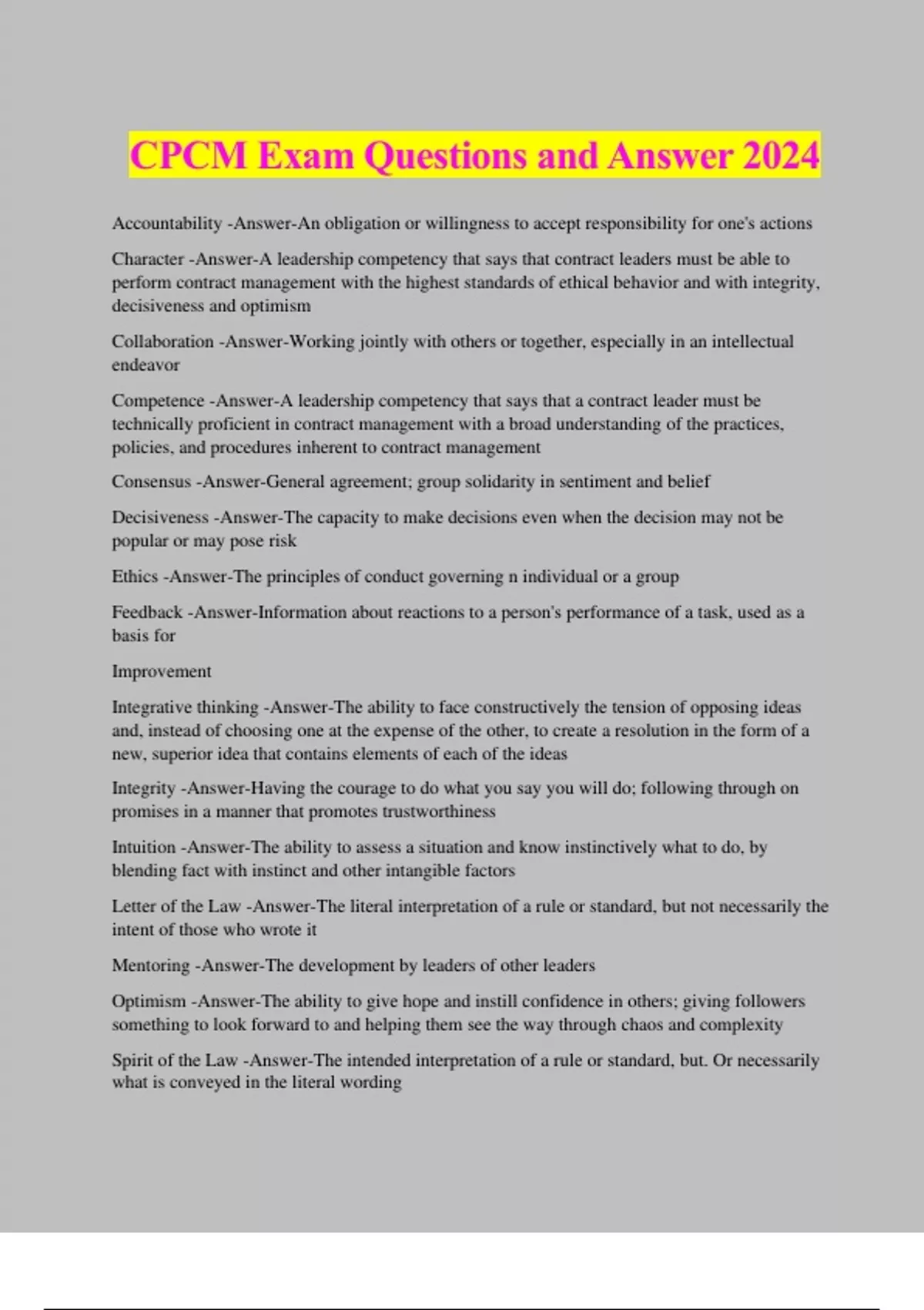 CPCM Exam Questions and Answer 2024 Accountability -Answer-An obligation or willingness to accept responsibility for one's actions Character -Answer-A leadership competency that says that contract leaders must be able to perform contract management with the highest standards of ethical behavior and with integrity, decisiveness and optimism Collaboration -Answer-Working jointly with others or together, especially in an intellectual endeavor Competence -Answer-A leadership competency that says that a contract leader must be technically proficient in contract management with a broad understanding of the practices, policies, and procedures inherent to contract management Consensus -Answer-General agreement; group solidarity in sentiment and belief Decisiveness -Answer-The capacity to make decisions even when the decision may not be popular or may pose risk Ethics -Answer-The principles of conduct governing n individual or a group Feedback -Answer-Information about reactions to a person's performance of a task, used as a basis for Improvement Integrative thinking -Answer-The ability to face constructively the tension of opposing ideas and, instead of choosing one at the expense of the other, to create a resolution in the form of a new, superior idea that contains elements of each of the ideas Integrity -Answer-Having the courage to do what you say you will do; following through on promises in a manner that promotes trustworthiness Intuition -Answer-The ability to assess a situation and know instinctively what to do, by blending fact with instinct and other intangible factors Letter of the Law -Answer-The literal interpretation of a rule or standard, but not necessarily the intent of those who wrote it Mentoring -Answer-The development by leaders of other leaders Optimism -Answer-The ability to give hope and instill confidence in others; giving followers something to look forward to and helping them see the way through chaos and complexity Spirit of the Law -Answer-The intended interpretation of a rule or standard, but. Or necessarily what is conveyed in the literal wording Succession planning -Answer-Empowering others and helping them develop, so they become capable of taking over the leader's job Values -Answer-Individual or personal standards of what is valuable or important Vision -Answer-Being able to see the possibilities for a better future and guiding others on getting there Accounting -Answer-The way an organization collects, organizes, and records financial information for making management decisions; the way to report a company's transactions and to maintain accountability for its assets and liabilities. Accounting System -Answer-A formal communications network that supplies relevant information for planning, control, decision-making, and evaluation. Acid test ratio -Answer-The ratio determining how well the company's current liabilities can be satisfied by its current assets less inventory. Activity-based costing system -Answer-An accounting system focused on production cycle and based on the principles that an output needs activities to produce it and that those activities use certain resources; assigns costs through cost drivers that the activities use to create the outputs. Administrative lead time -Answer-A measurement used by some organizations of howling it takes to award a contract,starting when a procurement request is received and ending when the contract is awarded. Asset -Answer-Something a company owns that has value and that can be sold or used by the company to make products or provide services that can be sold Balance sheet -Answer-Provides detailed information about a company's assets, liabilities, and shareholder equity Bottom line -Answer-A company's total earnings or losses over a specific time period, after accounting for costs and expenses; also called net income. Burn rate -Answer-An average of the estimated costs per month, often based on staffing estimates, used for estimating funding requirements. Cash flow statement -Answer-A statement reporting a company's inflow and outflow of cash; generally includes operating activities, investing activities, and financing activities. Competition -Answer-The effort or action of two or more commercial companies to obtain the same business from a third party Contingency planning -Answer-Involves "what if?" Analysis to look at various situations if certain environmental or economic conditions change Current -Answer-Current assets are assets which can be converted into cash within one year; current liabilities are obligations that a business must pay within one year. Current ratio -Answer-The ratio of current assets to current liabilities Debt-to-Equity Ratio -Answer-The ratio measuring the relationship of debt and shareholder equity used to finance the company's operations Demand -Answer-Describes how buyers shave in the marketplace; the quantity a buyer demands is what a buyer is willing to buy at a particular price Directing -Answer-The management of people and processes to accomplish objectives Economics -Answer-The science conc