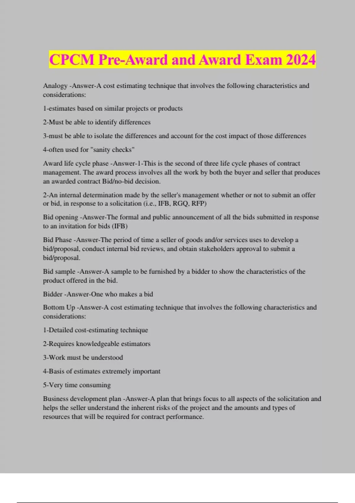 CPCM Pre-Award and Award Exam 2024 Analogy -Answer-A cost estimating technique that involves the following characteristics and considerations: 1-estimates based on similar projects or products 2-Must be able to identify differences 3-must be able to isolate the differences and account for the cost impact of those differences 4-often used for "sanity checks" Award life cycle phase -Answer-1-This is the second of three life cycle phases of contract management. The award process involves all the work by both the buyer and seller that produces an awarded contract Bid/no-bid decision. 2-An internal determination made by the seller's management whether or not to submit an offer or bid, in response to a solicitation (i.e., IFB, RGQ, RFP) Bid opening -Answer-The formal and public announcement of all the bids submitted in response to an invitation for bids (IFB) Bid Phase -Answer-The period of time a seller of goods and/or services uses to develop a bid/proposal, conduct internal bid reviews, and obtain stakeholders approval to submit a bid/proposal. Bid sample -Answer-A sample to be furnished by a bidder to show the characteristics of the product offered in the bid. Bidder -Answer-One who makes a bid Bottom Up -Answer-A cost estimating technique that involves the following characteristics and considerations: 1-Detailed cost-estimating technique 2-Requires knowledgeable estimators 3-Work must be understood 4-Basis of estimates extremely important 5-Very time consuming Business development plan -Answer-A plan that brings focus to all aspects of the solicitation and helps the seller understand the inherent risks of the project and the amounts and types of resources that will be required for contract performance.
