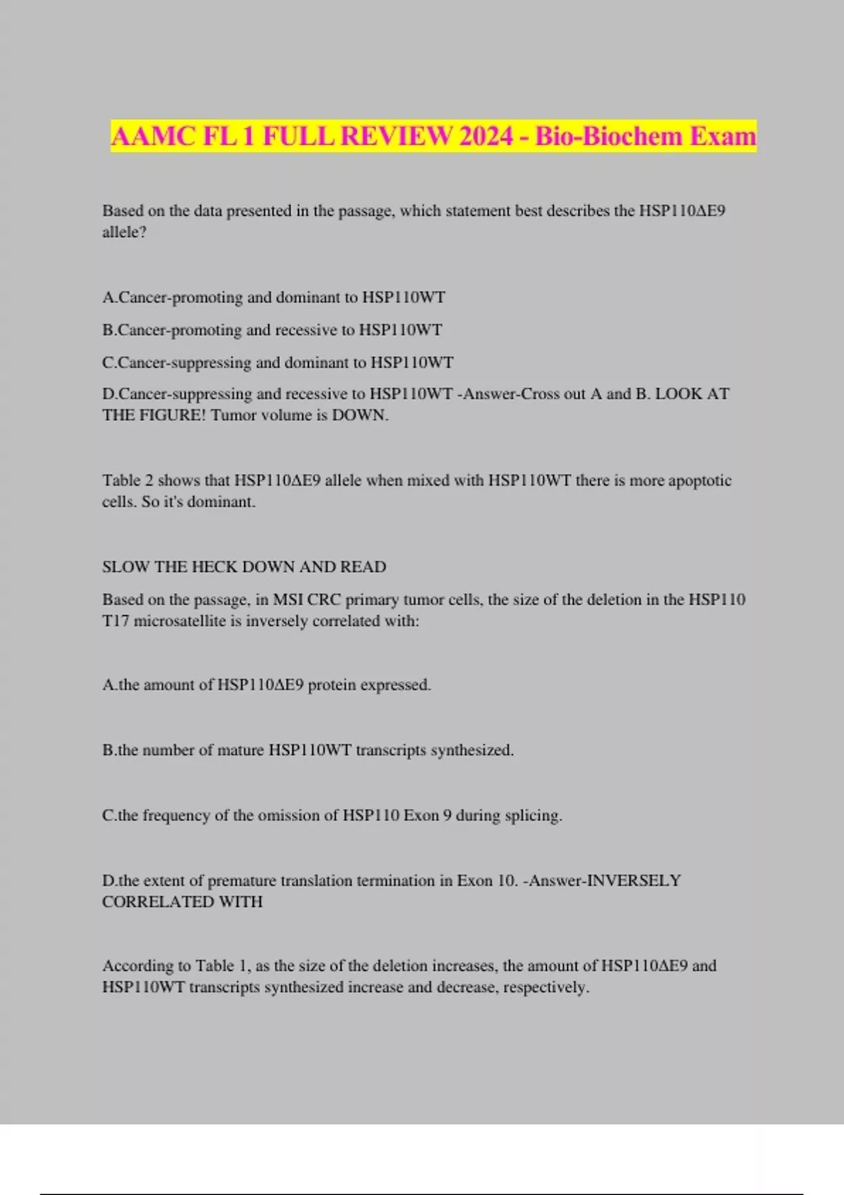 AAMC FL 1 FULL REVIEW 2024 - Bio-Biochem Exam Based on the data presented in the passage, which statement best describes the HSP110ΔE9 allele? A.Cancer-promoting and dominant to HSP110WT B.Cancer-promoting and recessive to HSP110WT C.Cancer-suppressing and dominant to HSP110WT D.Cancer-suppressing and recessive to HSP110WT -Answer-Cross out A and B. LOOK AT THE FIGURE! Tumor volume is DOWN. Table 2 shows that HSP110ΔE9 allele when mixed with HSP110WT there is more apoptotic cells. So it's dominant. SLOW THE HECK DOWN AND READ Based on the passage, in MSI CRC primary tumor cells, the size of the deletion in the HSP110 T17 microsatellite is inversely correlated with: A.the amount of HSP110ΔE9 protein expressed. B.the number of mature HSP110WT transcripts synthesized. C.the frequency of the omission of HSP110 Exon 9 during splicing. D.the extent of premature translation termination in Exon 10. -Answer-INVERSELY CORRELATED WITH According to Table 1, as the size of the deletion increases, the amount of HSP110ΔE9 and HSP110WT transcripts synthesized increase and decrease, respectively. also: The larger HSP110 T17 deletions cause Exon 9 to be omitted from the final sequence during pre-mRNA processing. This generates a premature stop codon in Exon 10, resulting in the mutant protein HSP110ΔE9. You're going to have MORE PRE-MATURE transcripts, SO LESS mature ones. A man with a CRC mutation that results in the synthesis of HSP110ΔE9 and a woman that does not carry this mutation in any of her tissues have a child. What is the percent chance that the child will inherit the CRC mutation? A.0% B.25% C.50% D.100% passage: People with MSI CRC have HSP110ΔE9 transcripts in cancerous tissue only. -Answer- YOU AINT GONNA PASS DOWN CANCEROUS TISSUE A! Which nucleotide pairing(s) would be recognized by the MMR system during DNA replication? dTMP and dCMP dGMP and dAMP dAMP and dTMP A.I only B.III only C.I and II only D.I, II, and III -Answer-Looking for mismatched bases!