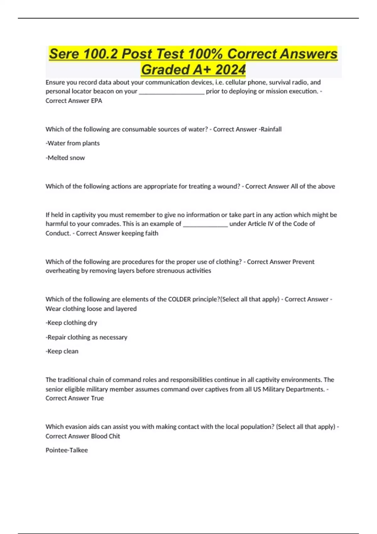 Sere 100.2 Post Test 100% Correct Answers Graded A+ 2024 Ensure you record data about your communication devices, i.e. cellular phone, survival radio, and personal locator beacon on your ___________________ prior to deploying or mission execution. - Correct Answer EPA Which of the following are consumable sources of water? - Correct Answer -Rainfall -Water from plants -Melted snow Which of the following actions are appropriate for treating a wound? - Correct Answer All of the above If held in captivity you must remember to give no information or take part in any action which might be harmful to your comrades. This is an example of _____________ under Article IV of the Code of Conduct. - Correct Answer keeping faith Which of the following are procedures for the proper use of clothing? - Correct Answer Prevent overheating by removing layers before strenuous activities Which of the following are elements of the COLDER principle?(Select all that apply) - Correct Answer -Wear clothing loose and layered -Keep clothing dry -Repair clothing as necessary