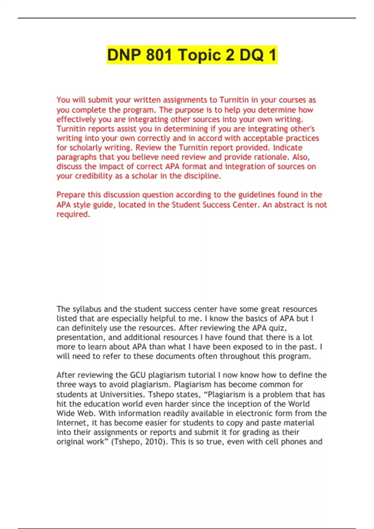 DNP 801 Topic 2 DQ 1 You will submit your written assignments to Turnitin in your courses as you complete the program. The purpose is to help you determine how effectively you are integrating other sources into your own writing. Turnitin reports assist you in determining if you are integrating other's writing into your own correctly and in accord with acceptable practices for scholarly writing. Review the Turnitin report provided. Indicate paragraphs that you believe need review and provide rationale. Also, discuss the impact of correct APA format and integration of sources on your credibility as a scholar in the discipline. Prepare this discussion question according to the guidelines found in the APA style guide, located in the Student Success Center. An abstract is not required. The syllabus and the student success center have some great resources listed that are especially helpful to me. I know the basics of APA but I can definitely use the resources. After reviewing the APA quiz, presentation, and additional resources I have found that there is a lot more to learn about APA than what I have been exposed to in the past. I will need to refer to these documents often throughout this program.