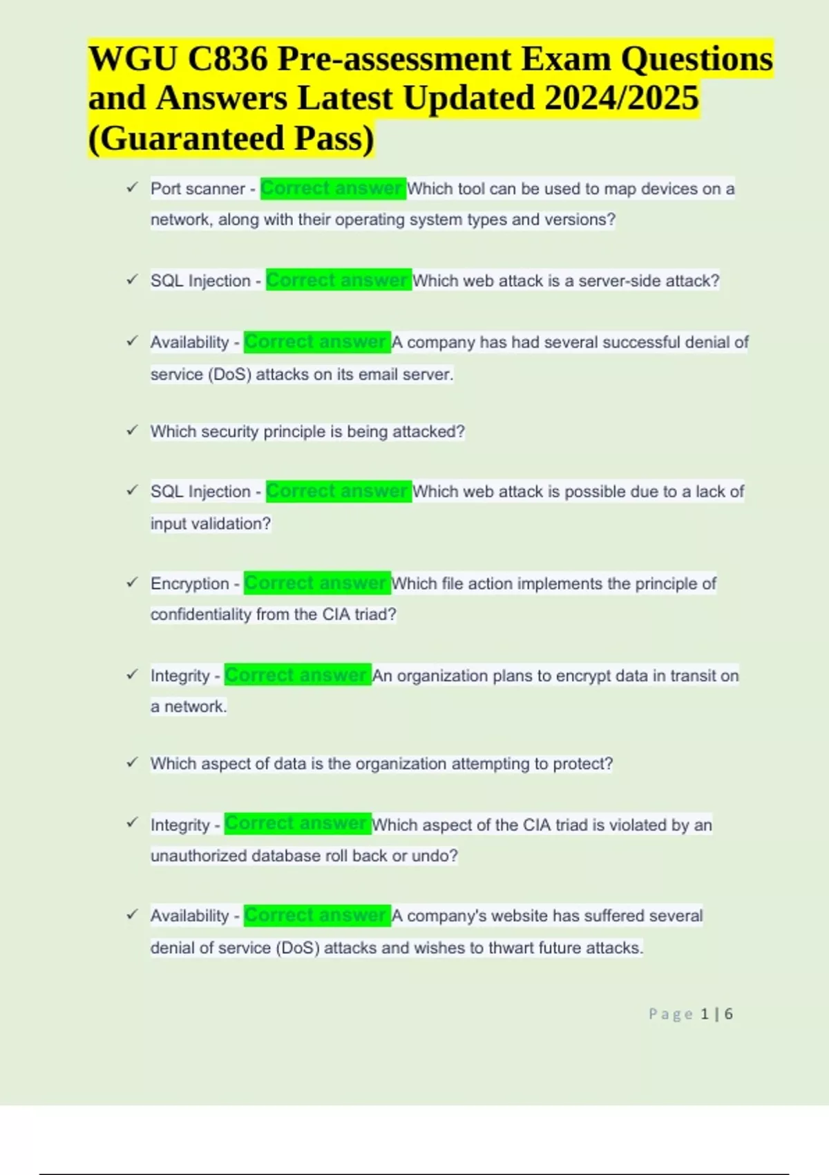 WGU C836 Pre-assessment Exam Questions and Answers Latest Updated 2024/2025 (Guaranteed Pass) Port scanner - Correct answer Which tool can be used to map devices on a network, along with their operating system types and versions? SQL Injection - Correct answer Which web attack is a server-side attack? Availability - Correct answer A company has had several successful denial of service (DoS) attacks on its email server. Which security principle is being attacked? SQL Injection - Correct answer Which web attack is possible due to a lack of input validation? Encryption - Correct answer Which file action implements the principle of confidentiality from the CIA triad? Integrity - Correct answer An organization plans to encrypt data in transit on a network. Which aspect of data is the organization attempting to protect? Integrity - Correct answer Which aspect of the CIA triad is violated by an unauthorized database roll back or undo? Availability - Correct answer A company's website has suffered several denial of service (DoS) attacks and wishes to thwart future attacks. WGU C836 Pre-assessment Exam Questions and Answers Latest Updated 2024/2025 (Guaranteed Pass) P a g e 2 | 6 Which security principle is the company addressing? Availability - Correct answer An organization has a requirement that all database servers and file servers be configured to maintain operations in the presence of a failure. Which principle of the CIA triad is this requirement implementing? Operations - Correct answer A company's website policy states that "To gain access to the corporate website, each employee must provide a valid user name and password, and then answer one of six security questions accurately." Which type of security does the policy address? Attribute-based - Correct answer A company wants to update its access control policy. The company wants to prevent hourly employees from logging in to company computers after business hours. Which type of access control policy should be implemented? Relocate the algorithm to encrypted storage. - Correct answer A new software development company has determined that one of its proprietary algorithms is at a high risk for unauthorized disclosure. The company's security up to this point has been fairly lax. Which procedure should the company implement to protect this asset? Restrict account permissions. - Correct answer How can an operating system be hardened in accordance to the principle of least privilege? P a g e 3 | 6 Limit user account privileges. - Correct answer A user runs an application that has been infected with malware that is less than 24 hours old. The malware then infects the operating system. Which safeguard should be implemented to prevent this type of attack? Weak Passwords - Correct answer A module in a security awareness course shows a user making use of two-factor authentication using a hardware token. Which security failure is being addressed by this training module? A fuzzer - Correct answer Which tool should an application developer use to help identify input validation vulnerabilities?