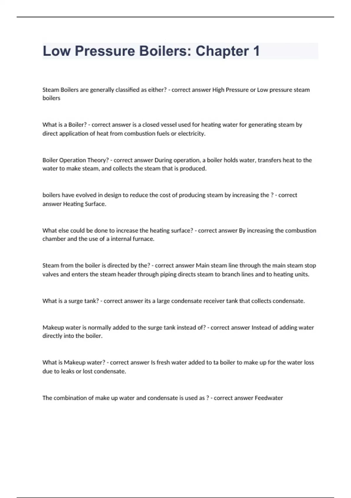 Low Pressure Boilers Chapter 1 Question and answers already passed 2023/2024 Steam Boilers are generally classified as either? - correct answer High Pressure or Low pressure steam boilers What is a Boiler? - correct answer is a closed vessel used for heating water for generating steam by direct application of heat from combustion fuels or electricity. Boiler Operation Theory? - correct answer During operation, a boiler holds water, transfers heat to the water to make steam, and collects the steam that is produced. boilers have evolved in design to reduce the cost of producing steam by increasing the ? - correct answer Heating Surface. What else could be done to increase the heating surface? - correct answer By increasing the combustion chamber and the use of a internal furnace. Steam from the boiler is directed by the? - correct answer Main steam line through the main steam stop valves and enters the steam header through piping directs steam to branch lines and to heating units. What is a surge tank? - correct answer its a large condensate receiver tank that collects condensate. Makeup water is normally added to the surge tank instead of? - correct answer Instead of adding water directly into the boiler