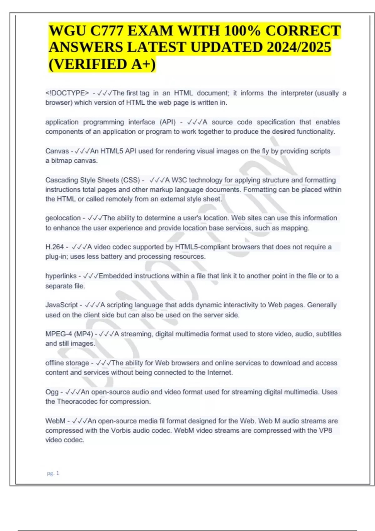 WGU C777 EXAM WITH 100% CORRECT ANSWERS LATEST UPDATED 2024/2025 (VERIFIED A+) The first tag in an HTML document; it informs the interpreter (usually a browser) which version of HTML the web page is written in. application programming interface (API) - A source code specification that enables components of an application or program to work together to produce the desired functionality. Canvas - An HTML5 API used for rendering visual images on the fly by providing scripts a bitmap canvas. Cascading Style Sheets (CSS) - A W3C technology for applying structure and formatting instructions total pages and other markup language documents. Formatting can be placed within the HTML or called remotely from an external style sheet. geolocation - The ability to determine a user's location. Web sites can use this information to enhance the user experience and provide location base services, such as mapping. H.264 - A video codec supported by HTML5-compliant browsers that does not require a plug-in; uses less battery and processing resources. hyperlinks - Embedded instructions within a file that link it to another point in the file or to a separate file. JavaScript - A scripting language that adds dynamic interactivity to Web pages. Generally used on the client side but can also be used on the server side. MPEG-4 (MP4) - A streaming, digital multimedia format used to store video, audio, subtitles and still images. offline storage - The ability for Web browsers and online services to download and access content and services without being connected to the Internet. Ogg - An open-source audio and video format used for streaming digital multimedia. Uses the Theoracodec for compression. WebM - An open-source media fil format designed for the Web. Web M audio streams are compressed with the Vorbis audio codec. WebM video streams are compressed with the VP8 video codec. WGU C777 EXAM WITH 100% CORRECT ANSWERS LATEST UPDATED 2024/2025 (VERIFIED A+) pg. 2 class selector - A selector that specifies CSS styles for a group of elements. CSS rule - In a style sheet, a format instruction that consists of a specified selector and the properties and values applied to it. document flow - In CSS, the arrangement of content elements on a page and how the space is used. id selector - A selector that specifies CSS styles for one unique element. Multipurpose Internet Mail Extensions (MIME) - Defiens the file type, such as text or video, and the extension, such as css or mp4, for a user agent or browser. property - A descriptive characteristic of an object (such as color, width or height) that the developer stipulates in the creation of the object. @font-face - CSS3 rule that defines an7y font desired by a Web designer; the font library is hosted on the Web server. CSS declaration - In a style sheet, a property and a value applied to a format a specified HTML element (selector). A declaration combined with a selector is a CSS rule. CSS selector - In a style sheet, any HTML element to which designated styles are applied. opacity - The amount of transparency in an element's appearance. Can be specified for various elements and properties using CSS. @key frames - A CSS3 at-rule that defines an animation and its position. overlay - A CSS3 technique used to place an HTML element on top of another HTML element. RGBA - Specifies the RGB (Red, Green, Blue) colors of an element, with an additional value (Alpha) for defining the opacity. For example, background: rgba(215, 143, 112, 0.4). transform - A CSS3 effect that changes the shape, size and or position of an element. transition - CSS3 effect that gradually changes an element from one style to another style. pg. 3 user interface - The interaction between a Web page and the person using it. Generally, but no always, accepts user commands and returns information. Z-axis - An axis used along X and Y for specifying Cartesian coordinates in three dimensions, whereas only the X-axis and Y-axis are used for two-dimensional coordinates. conatenation - Synthesis of code to simplify it and reduce duplication; linking two or more units of information, such as strings or files, to form one unit. dot notation - A reference technique used to access a property or method of an object. expression - Part of a statement that is evaluated as a value; it can use any combination of variables, operators, and other expressions. graphical user interface (GUI) - A program that provides graphical navigation with menus and screen icons. Hypertext Markup Language (HTML) - The traditional authoring languaged used to develop Webpages for many applications. method - An action that can be performed by an object. object - A self-containted programming component modeled after abstract or real "objects" that contains properties and methods needed to make a certain type of data useful. operand - Data that is to be operated upon or manipulated in some manner. operator - A symbol character used in programming expressions to instruct the program how to store or manipulate (operate on) a value. scripting language - An interpreted programming language designed to simplify application development. user agent - The W3C term for any application, such as a Web browser or help engine, that renders HTML for display to users. pg. 4 value - The specific quality (such as a specified color, width or height) that belongs to the property of an object. variable - A named space of memory that holds a value. The value can change depending on a condition or information passed to the program, or be reassignment of a new value. argument - A value or expression containing data or code that is passed on to a function or procedure. Also called a parameter. calling statement - A statement that transfers program execution to a subroutine, procedure or function. When the subroutine is complete, execution transfers back to the command following the call statement. casting - In JavaScript, a technique for variable control in which a variable's val