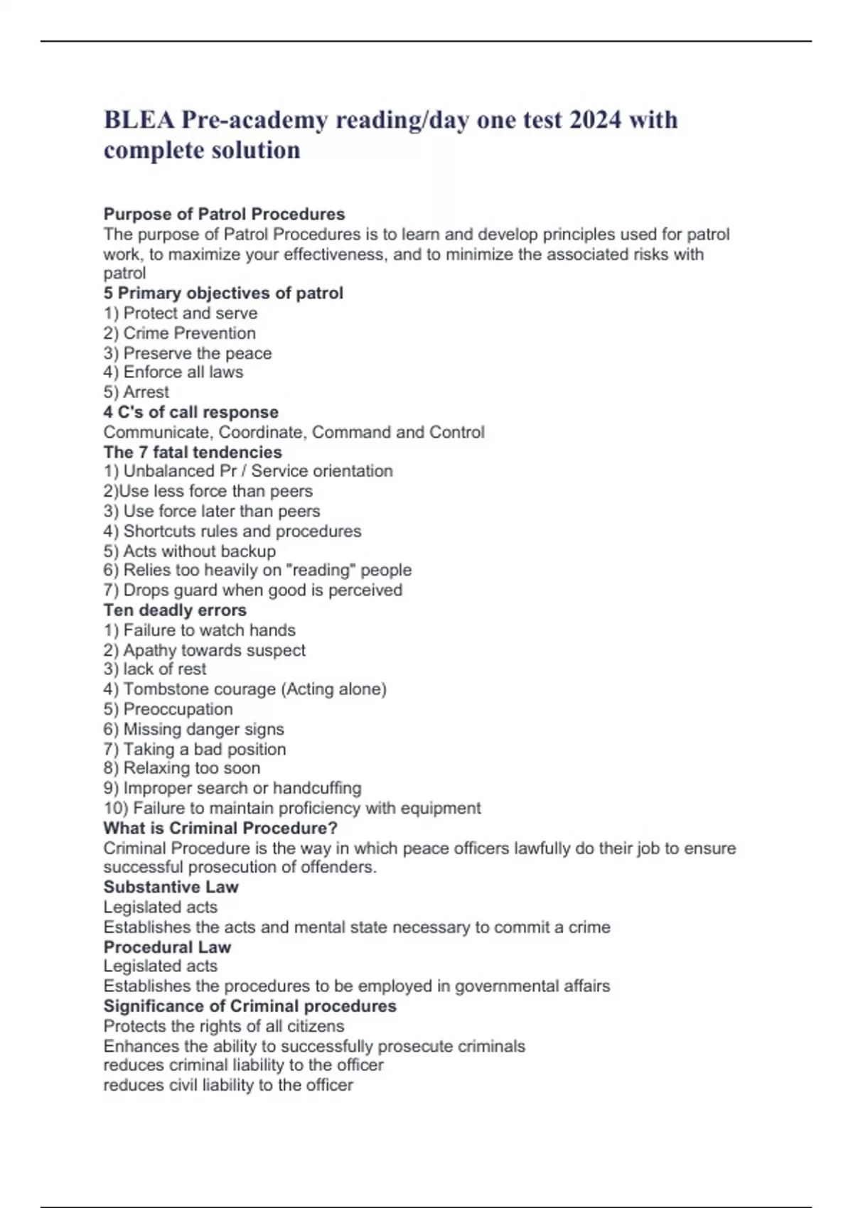 BLEA Pre-academy reading/day one test 2024 with complete solution Purpose of Patrol Procedures The purpose of Patrol Procedures is to learn and develop principles used for patrol work, to maximize your effectiveness, and to minimize the associated risks with patrol 5 Primary objectives of patrol 1) Protect and serve 2) Crime Prevention 3) Preserve the peace 4) Enforce all laws 5) Arrest 4 C's of call response Communicate, Coordinate, Command and Control The 7 fatal tendencies 1) Unbalanced Pr / Service orientation 2)Use less force than peers 3) Use force later than peers 4) Shortcuts rules and procedures 5) Acts without backup 6) Relies too heavily on "reading" people 7) Drops guard when good is perceived Ten deadly errors 1) Failure to watch hands 2) Apathy towards suspect 3) lack of rest 4) Tombstone courage (Acting alone) 5) Preoccupation 6) Missing danger signs 7) Taking a bad position 8) Relaxing too soon 9) Improper search or handcuffing 10) Failure to maintain proficiency with equipment What is Criminal Procedure? Criminal Procedure is the way in which peace officers lawfully do their job to ensure successful prosecution of offenders. Substantive Law Legislated acts Establishes the acts and mental state necessary to commit a crime Procedural Law Legislated acts Establishes the procedures to be employed in governmental affairs Significance of Criminal procedures Protects the rights of all citizens Enhances the ability to successfully prosecute criminals reduces criminal liability to the officer reduces civil liability to the officer