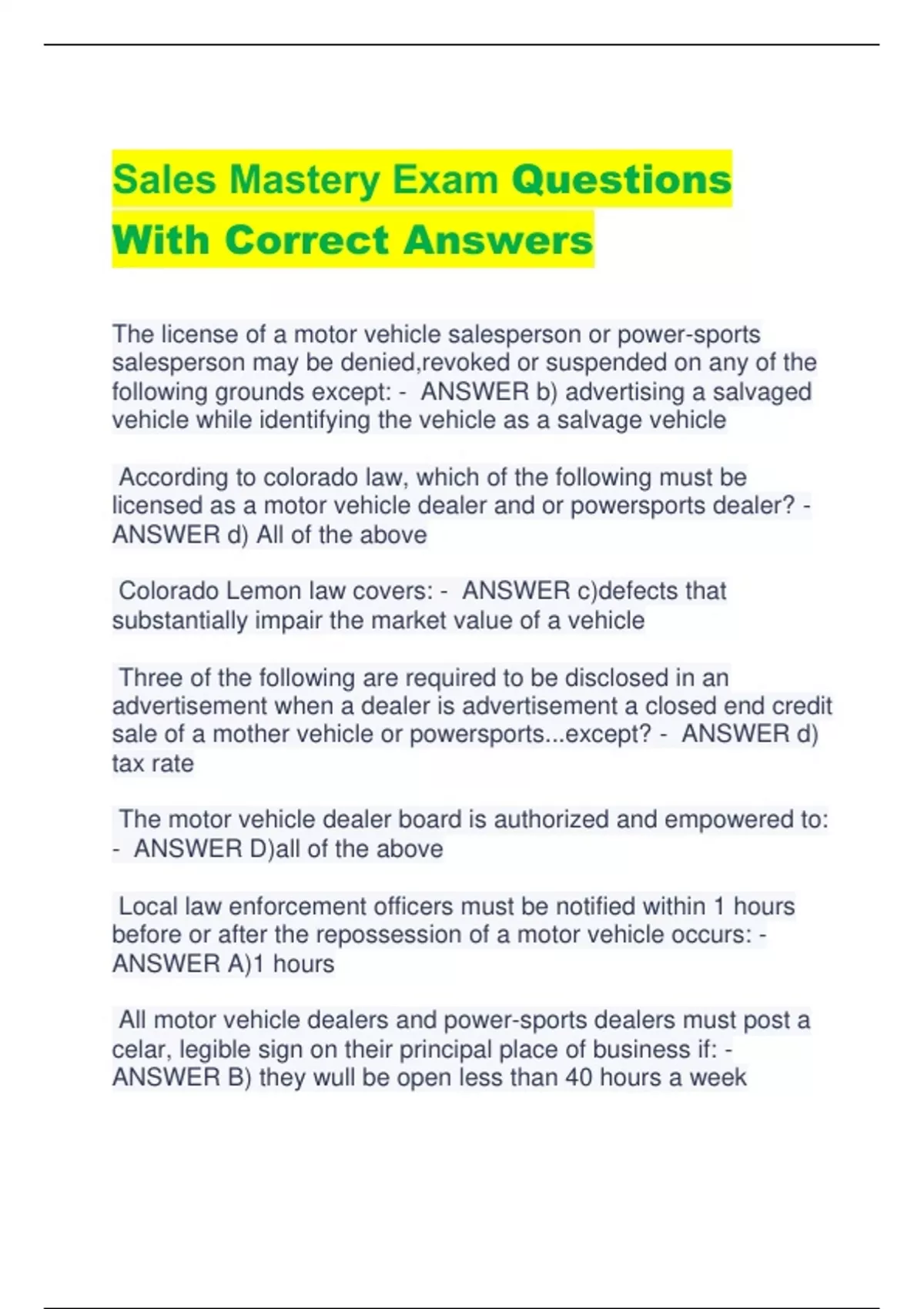 Sales Mastery Exam Questions With Correct Answers The license of a motor vehicle salesperson or power-sports salesperson may be denied,revoked or suspended on any of the following grounds except: - ANSWER b) advertising a salvaged vehicle while identifying the vehicle as a salvage vehicle According to colorado law, which of the following must be licensed as a motor vehicle dealer and or powersports dealer? - ANSWER d) All of the above Colorado Lemon law covers: - ANSWER c)defects that substantially impair the market value of a vehicle Three of the following are required to be disclosed in an advertisement when a dealer is advertisement a closed end credit sale of a mother vehicle or powersports...except? - ANSWER d) tax rate The motor vehicle dealer board is authorized and empowered to: - ANSWER D)all of the above Local law enforcement officers must be notified within 1 hours before or after the repossession of a motor vehicle occurs: - ANSWER A)1 hours All motor vehicle dealers and power-sports dealers must post a celar, legible sign on their principal place of business if: - ANSWER B) they wull be open less than 40 hours a week A dealer may issue a temporary permits for each roadworthy vehicle sold - ANSWER B) false (verify) The motor vehicle dealer board may be decide how large a fine to impose on a dealer who sells primarily vehicles that weigh 1,500 pounds or moreso long as it does not exeed 5k - ANSWER a)True (verify) The colorado consumer protection act declares bait and switch advertising to be deceptive trade practice. Bait and switch advertising includes which of the following - ANSWER d)all of the above Three of the following types of motor vehicles are exempt from the truth in mileage act. Which one is not exempt? - ANSWER B)motor vehicles with out-of-state titles The motor vehicle dealer board does not have among its members - ANSWER c)three employees from the enforcement division What is the highest fine per offense that the motor vehicle dealer board or an administrative law judge may impose on a dealer , who sells primarily vehicles that wigh less than 1,500 pounds - ANSWER $1,000 Three of the following are characteristics of an off-premise permit. . WHich one is not? - ANSWER The permit cannot exceed six days except for the national western stock show, the colorado state fair, greely stampede Which of the following is a true statement regarding dealers and buyers? - ANSWER B) a dealer shall clearly indicate on the costumer contract when a vehicle sold "as is" and withou a guarantee When advertising a specific number of motor vehicles that same number of vehicles must have been invoiced to the dealer - ANSWER A)True Dealers must either be self insured or have insurance for their vehicles - ANSWER A)True In transite plates may be used on motor vehicles - ANSWER D) consigned to wholesale auction dealers for transport from point of purchase to point of storage When a salesperson leaves a dealer, that dealer must do all of the following except - ANSWER Immediately employ a new salesperson, licensed or not The license of a new or used dealer, wholesale auction dealer or wholesaler may be denied suspended, revoked or fined for all of the following grounds except - ANSWER Employing a properly licensed salesperson