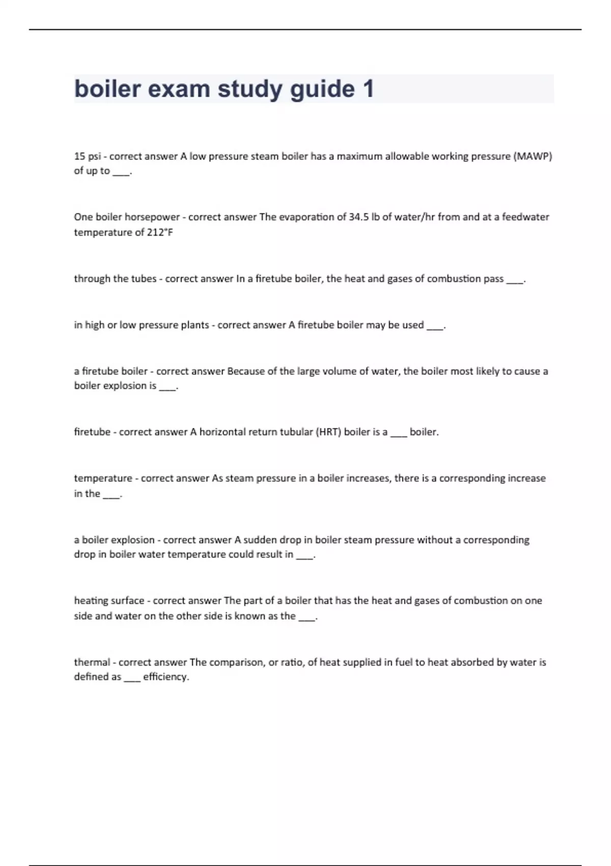 boiler exam study guide 1 Question and answers correctly solved 2023/202415 psi - correct answer A low pressure steam boiler has a maximum allowable working pressure (MAWP) of up to ___. One boiler horsepower - correct answer The evaporation of 34.5 lb of water/hr from and at a feedwater temperature of 212°F through the tubes - correct answer In a firetube boiler, the heat and gases of combustion pass ___. in high or low pressure plants - correct answer A firetube boiler may be used ___. a firetube boiler - correct answer Because of the large volume of water, the boiler most likely to cause a boiler explosion is ___. firetube - correct answer A horizontal return tubular (HRT) boiler is a ___ boiler. temperature - correct answer As steam pressure in a boiler increases, there is a corresponding increase in the ___. a boiler explosion - correct answer A sudden drop in boiler steam pressure without a corresponding drop in boiler water tem