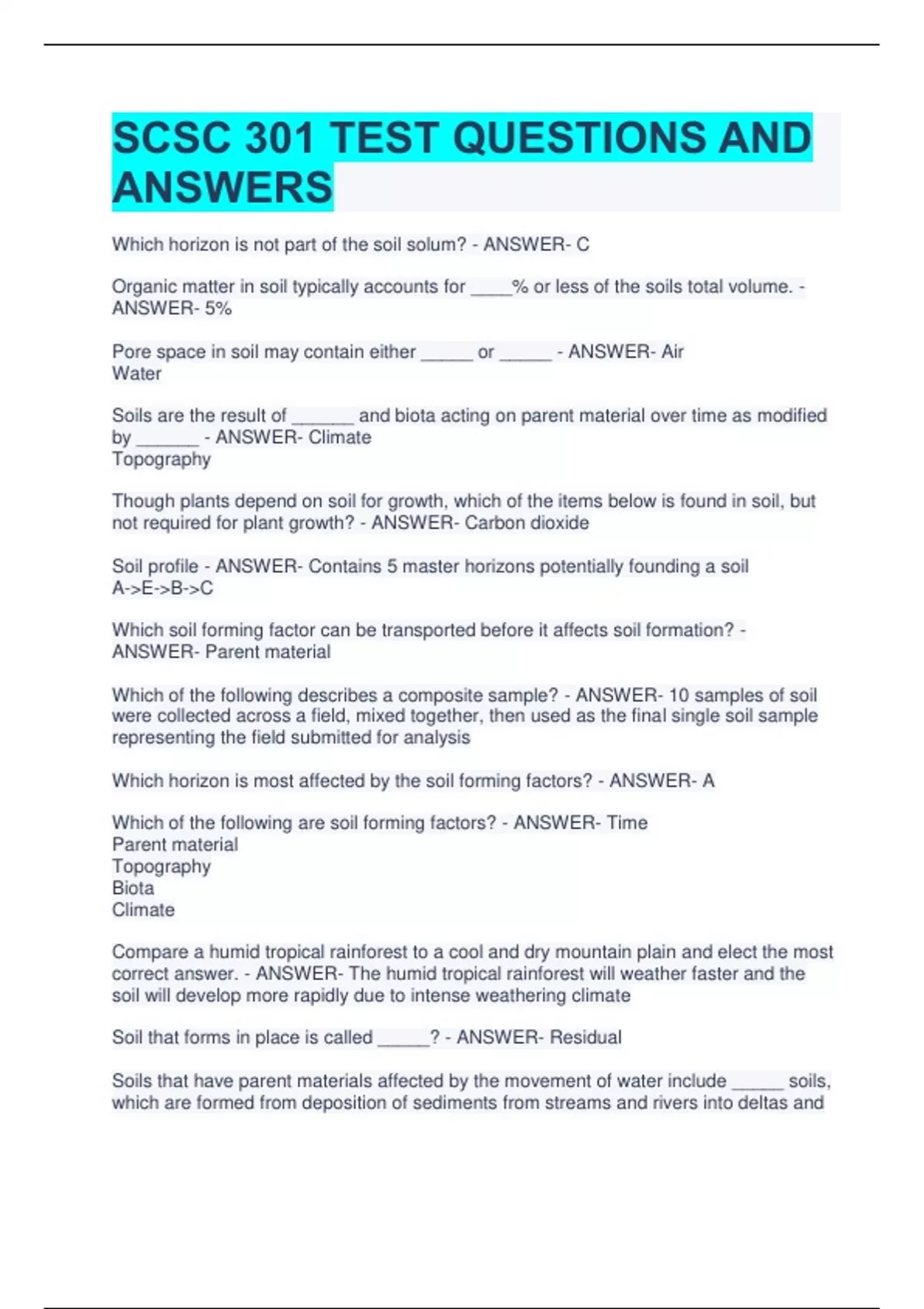 SCSC 301 TEST QUESTIONS AND ANSWERS Which horizon is not part of the soil solum? - ANSWER- C Organic matter in soil typically accounts for ____% or less of the soils total volume. - ANSWER- 5% Pore space in soil may contain either _____ or _____ - ANSWER- Air Water Soils are the result of ______ and biota acting on parent material over time as modified by ______ - ANSWER- Climate Topography Though plants depend on soil for growth, which of the items below is found in soil, but not required for plant growth? - ANSWER- Carbon dioxide Soil profile - ANSWER- Contains 5 master horizons potentially founding a soil A->E->B->C Which soil forming factor can be transported before it affects soil formation? - ANSWER- Parent material Which of the following describes a composite sample? - ANSWER- 10 samples of soil were collected across a field, mixed together, then used as the final single soil sample representing the field submitted for analysis Which horizon is most affected by the soil forming factors? - ANSWER- A Which of the following are soil forming factors? - ANSWER- Time Parent material Topography Biota Climate Compare a humid tropical rainforest to a cool and dry mountain plain and elect the most correct answer. - ANSWER- The humid tropical rainforest will weather faster and the soil will develop more rapidly due to intense weathering climate Soil that forms in place is called _____? - ANSWER- Residual Soils that have parent materials affected by the movement of water include _____ soils, which are formed from deposition of sediments from streams and rivers into deltas and floodplains, and _____ soils, which are formed from deposition of sediment by lakes. - ANSWER- Alluvial Lacustrine A mineral, such as quartz, that has not been altered since its formation from magma is a _____ mineral. - ANSWER- Primary Which of the following are primary minerals? - ANSWER- Mica Quartz Olivine Hornblende Feldspar As a primary mineral weather to form secondary minerals, elements can sometimes be lost. Which of the following are most likely to be lost to leaching? - ANSWER- Calcium (Ca) Potassium (K) Sodium (Na) Soil organic matter forms from the decomposition of _____ - ANSWER- Animal residue Manure Microorganism residue Plant residue By volume, soil is made up of which of the following? - ANSWER- Mineral matter Air Water Organic matter Organic matter is made of carbon compounds. When it decomposes, what gas forms? - ANSWER- Carbon dioxide (C02) Another word for soil organic matter is _____ - ANSWER- Humus The color of soil organic matter is ____, which also influences the color of surface soils. - ANSWER- Dark brown to black Which primary mineral is relatively resistant to weathering and does not weather into another mineral? - ANSWER- Quartz Horizons - ANSWER- O,A,E,B,C Soil Solum - ANSWER- O,A,E,B Regolith - ANSWER- C Topsoil vs. subsoil - ANSWER- TOP- More affect from soil forming factors (darker, more organisms) & usually more porous, smaller aggregates, less clay and more sand/silt Topsoil vs. subsoil - ANSWER- SUB- Less affect from soil forming factors (lighter in color, fewer organism) & usually less porous ( more compacted) larger aggregates, more clay Pedon - ANSWER- Smallest 3D unit of soil with all the soil characteristics Polypedon - ANSWER- Group of smaller pedons 4 major soil components - ANSWER- Solids- Mineral matter (~45%) Organic matter (~5%) Pore space- Air (25%) Water (25%) Sand particles - ANSWER- Largest, low affinity for water, nutrients and each other Silt particles - ANSWER- Medium sized, moderate affinity for water, nutrients and each other, low affinity for nutrients Clay particles - ANSWER- Smallest (largest surface area) High affinity for water, nutrients and each other Tends to aggregate Can act as a colloid