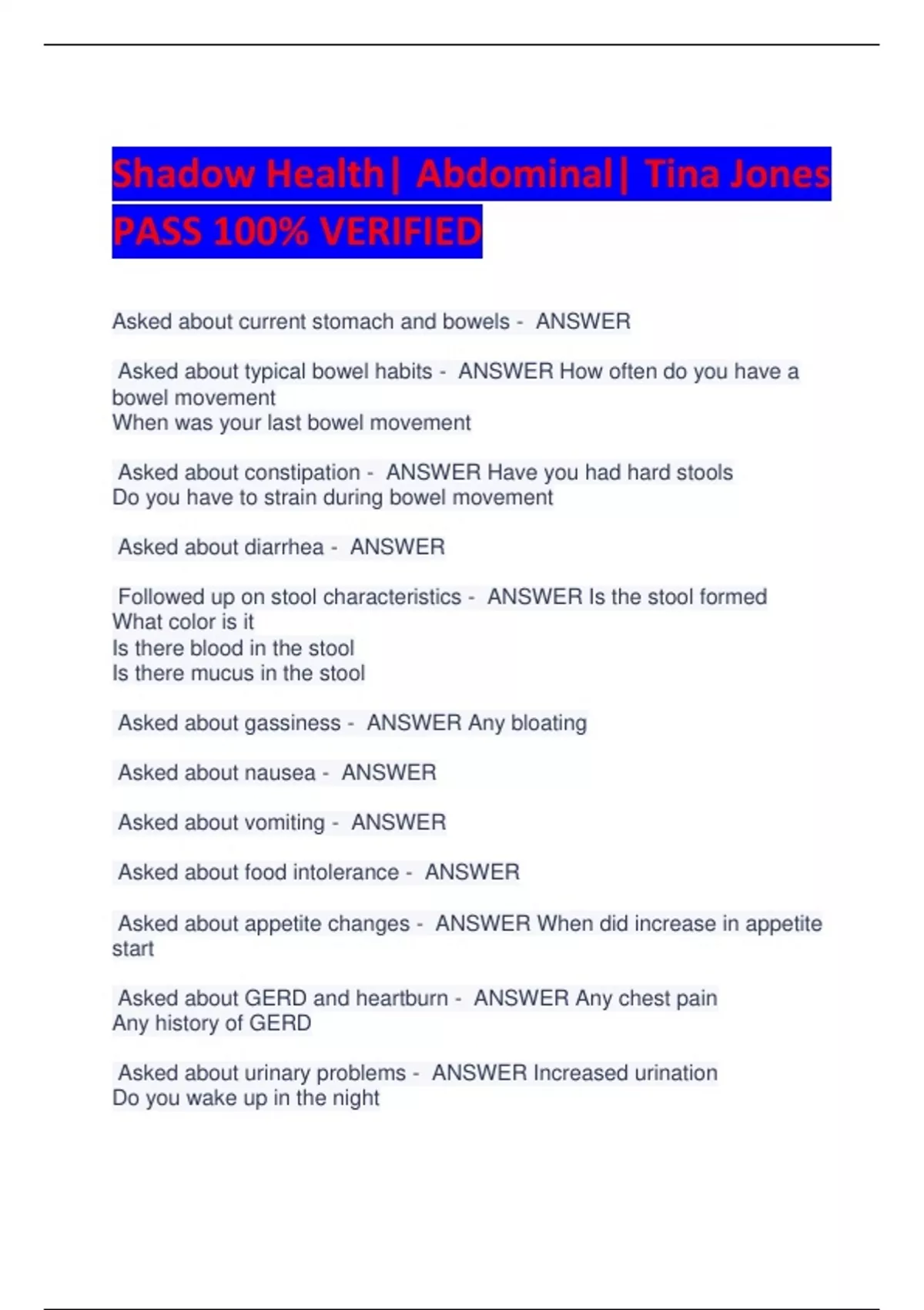 Shadow Health| Abdominal| Tina Jones PASS 100% VERIFIED Asked about current stomach and bowels - ANSWER Asked about typical bowel habits - ANSWER How often do you have a bowel movement When was your last bowel movement Asked about constipation - ANSWER Have you had hard stools Do you have to strain during bowel movement Asked about diarrhea - ANSWER Followed up on stool characteristics - ANSWER Is the stool formed What color is it Is there blood in the stool Is there mucus in the stool Asked about gassiness - ANSWER Any bloating Asked about nausea - ANSWER Asked about vomiting - ANSWER Asked about food intolerance - ANSWER Asked about appetite changes - ANSWER When did increase in appetite start Asked about GERD and heartburn - ANSWER Any chest pain Any history of GERD