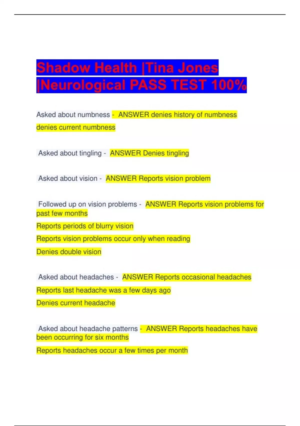 Shadow Health |Tina Jones |Neurological PASS TEST 100% Asked about numbness - ANSWER denies history of numbness denies current numbness Asked about tingling - ANSWER Denies tingling Asked about vision - ANSWER Reports vision problem Followed up on vision problems - ANSWER Reports vision problems for past few months Reports periods of blurry vision Reports vision problems occur only when reading Denies double vision Asked about headaches - ANSWER Reports occasional headaches Reports last headache was a few days ago Denies current headache Asked about headache patterns - ANSWER Reports headaches have been occurring for six months Reports headaches occur a few times per month Reports headaches last a few hours Asked about headache triggers - ANSWER Reports headaches occur only when studying Asked about headache character - ANSWER Reports headaches are not severe Reports headaches feel the same on both sides of the head Reports headaches are tight Reports headaches are throbbing Asked about headache treatment - ANSWER Reports treating headaches with acetaminophen (Tylenol) Reports taking regular strength acetaminophen medication Reports taking two pills at a time Asked about dizziness - ANSWER Denies dizziness Asked about speech - ANSWER Denies difficulty speaking Asked about swallowing - ANSWER Denies difficulty swallowing Asked about fainting - ANSWER Denies fainting Asked about muscle function - ANSWER Denies weakness Denies tremors Denies problems with balance Denies problems with coordination Asked about memory loss - ANSWER Denies memory loss Asked about behavior changes - ANSWER Denies recent changes in behavior Denies recent changes in mood Asked about illicit drug use - ANSWER Reports history of recreational marijuana smoking Asked about tobacco use - ANSWER Denies smoking tobacco Denies vaping