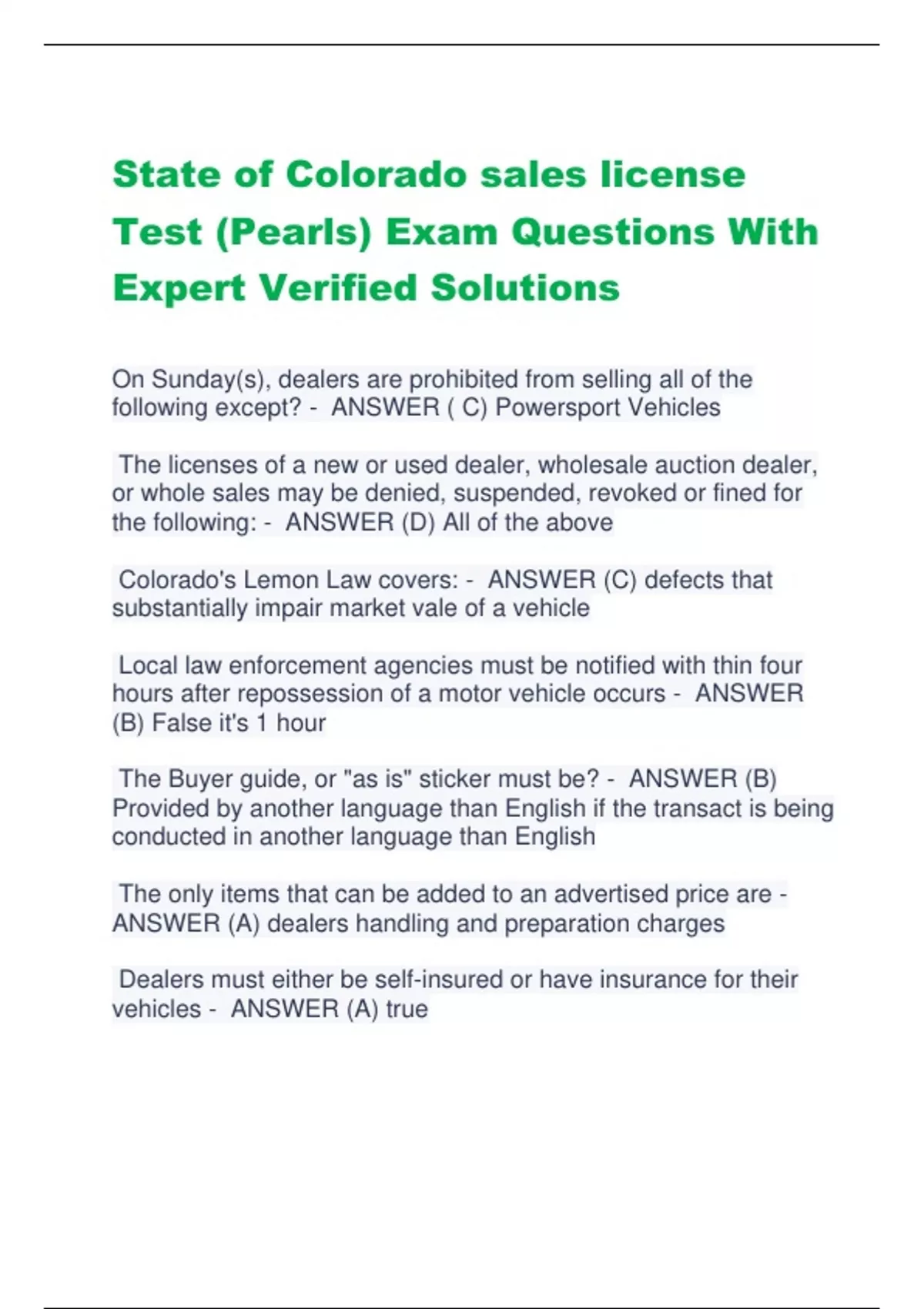 State of Colorado sales license Test (Pearls) Exam Questions With Expert Verified Solutions On Sunday(s), dealers are prohibited from selling all of the following except? - ANSWER ( C) Powersport Vehicles The licenses of a new or used dealer, wholesale auction dealer, or whole sales may be denied, suspended, revoked or fined for the following: - ANSWER (D) All of the above Colorado's Lemon Law covers: - ANSWER (C) defects that substantially impair market vale of a vehicle Local law enforcement agencies must be notified with thin four hours after repossession of a motor vehicle occurs - ANSWER (B) False it's 1 hour The Buyer guide, or "as is" sticker must be? - ANSWER (B) Provided by another language than English if the transact is being conducted in another language than English The only items that can be added to an advertised price are - ANSWER (A) dealers handling and preparation charges Dealers must either be self-insured or have insurance for their vehicles - ANSWER (A) true Is it acceptable for a licensed dealer to place an advertisement using only the name "ABC Enterprise"?. - ANSWER (B) False is has to say ABC enterprise dealership A dealer has how many days to deliver or facilitate delivery of title from the date of sale? - ANSWER (D) 30 days According to Colorado law , motor vehicle leasing company do NOT need a motor vehicle dealers license - ANSWER (B) False Three of the following are required to be disclosed in an advertisement when a dealer is advertising a close-end credit sale or a motor vehicle or power sport vehicle with a down payment amount, payment amount, number of payment, period of repayment or amount of financing charge. Which one is NOT required? - ANSWER (C) amount of percentage of the down payment Three of the following are deceptive trade of practices. Which one of the following is Not? - ANSWER (D) delivering goods as promised
