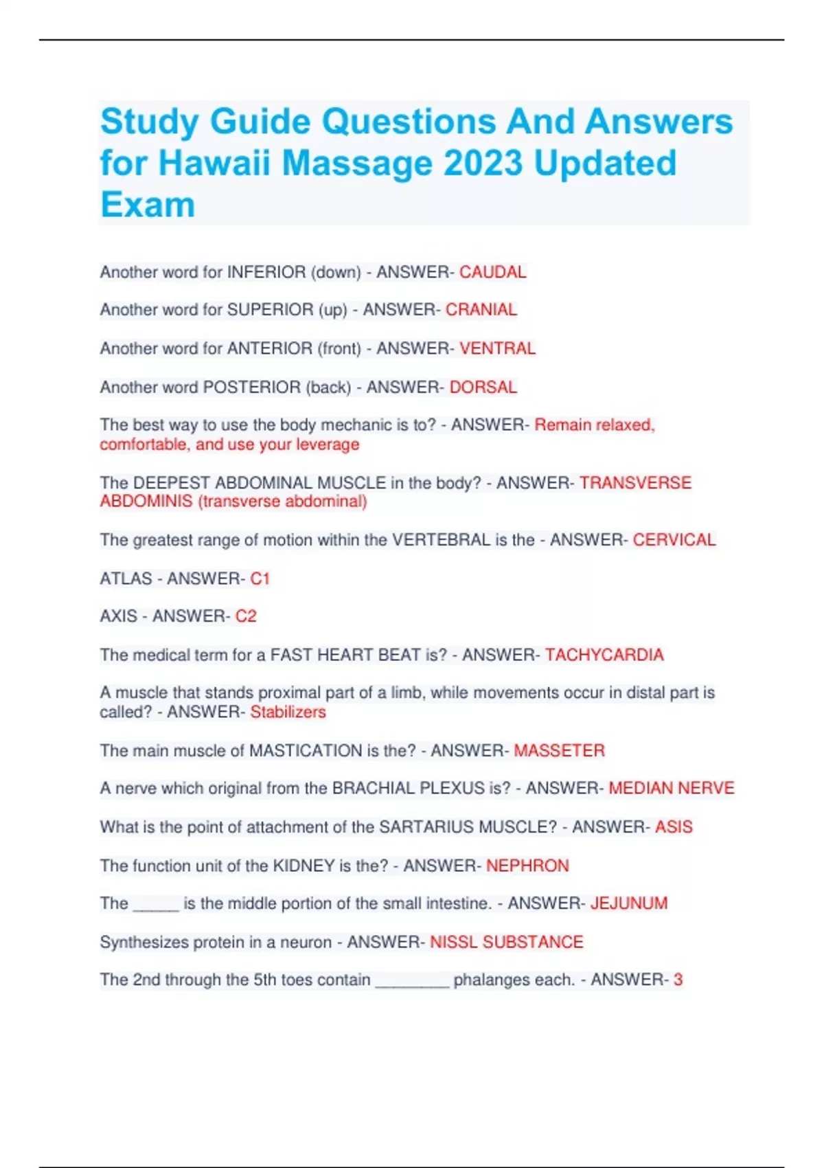 Study Guide Questions And Answers for Hawaii Massage 2023 Updated Exam Another word for INFERIOR (down) - ANSWER- CAUDAL Another word for SUPERIOR (up) - ANSWER- CRANIAL Another word for ANTERIOR (front) - ANSWER- VENTRAL Another word POSTERIOR (back) - ANSWER- DORSAL The best way to use the body mechanic is to? - ANSWER- Remain relaxed, comfortable, and use your leverage The DEEPEST ABDOMINAL MUSCLE in the body? - ANSWER- TRANSVERSE ABDOMINIS (transverse abdominal) The greatest range of motion within the VERTEBRAL is the - ANSWER- CERVICAL ATLAS - ANSWER- C1 AXIS - ANSWER- C2 The medical term for a FAST HEART BEAT is? - ANSWER- TACHYCARDIA A muscle that stands proximal part of a limb, while movements occur in distal part is called? - ANSWER- Stabilizers The main muscle of MASTICATION is the? - ANSWER- MASSETER A nerve which original from the BRACHIAL PLEXUS is? - ANSWER- MEDIAN NERVE What is the point of attachment of the SARTARIUS MUSCLE? - ANSWER- ASIS The function unit of the KIDNEY is the? - ANSWER- NEPHRON The _____ is the middle portion of the small intestine. - ANSWER- JEJUNUM Synthesizes protein in a neuron - ANSWER- NISSL SUBSTANCE The 2nd through the 5th toes contain ________ phalanges each. - ANSWER- 3 Abducens Nerve (VI) is responsible for: - ANSWER- EYE MOVMENT The bulb in the skin from which hair grows is called? - ANSWER- FOLLICLES The MAJOR VEIN that drains the upper arm is called? - ANSWER- BRACHIAL Bile is stored in the ____? - ANSWER- GALL BLADDER _____ is the LOWEST PRESSURE in the artery. - ANSWER- DIASTOLIC PRESSURE Nerve supply of RHOMBOIDS MUSCLES comes from the: - ANSWER- DORSAL SCAPULAR NERVE Where is the BRACHIAL BODY REGION? - ANSWER- Between elbow and shoulder. What GLAND in the body secretes INSULIN? - ANSWER- PANCREAS The ____, a secretion from the gastric glands of the stomach and is responsible for converting pepsinogen into pepsin. - ANSWER- HYDROCHLORIC ACID The anterior opening to the nasal cavity is called the ____. - ANSWER- Naris/ Nostril Sacs between bones - ANSWER- BURSA SACS Attach bones to other bones - ANSWER- LIGAMENT Attach muscle to bones - ANSWER- TENDONS Oxygenated blood enters the left side of the heart and exits through the _____ to the body. - ANSWER- AORTA The metatarsophalangeal joints are classified as - ANSWER- CONDYLOID Which of the following quadrants contain the liver? - ANSWER- RIGHT UPPER QUADRANT Refers to the pressure of the in the pleural cavity - ANSWER- PLEURAL PRESSURE Known as TRIANGULAR MUSCLES - ANSWER- CONVERGENT EPI = - ANSWER- ABOVE PERI= - ANSWER- AROUND ENDO= - ANSWER- INNER Which of the following muscle is PRIME EXTENSION of the ELBOW? - ANSWERTRICEPS BRACHI The basic plan of Care- ANSWER- Collecting information to ascertain client's life and career goals; plan current and future treatment An example of a gliding joint in the body - ANSWER- Interterevtebral (between vertebrae) Benefits of massage that take place as a result of its effect - ANSWER- Nervous and Circulatory System What is the treatment for INCONTINENCE? - ANSWER- KEGEL EXERCISE _____ is the emotional bond of people. Experience when concern is mutually expressed. - ANSWER- RAPPORT PETRISSAGE - ANSWER- To milk the muscle; lifting the muscle, blood, and lymph flow Skin Rolling The term that describes massage stroke towards to the heart. - ANSWERCENTRIPETAL What is S.O.A.P? - ANSWER- S-Subject, O-Objective, A-Assessment, P-Plan When using moist heat applications, you should? - ANSWER- Watch for Negative Reactions A chemical pack containing gel is called - ANSWER- HYDROCOLLATOR PACK The application of cold temporarily relieves pain by - ANSWER- DECREASING SENSORY INPUT Name of BONE in UPPER ARM - ANSWER- HUMERUS